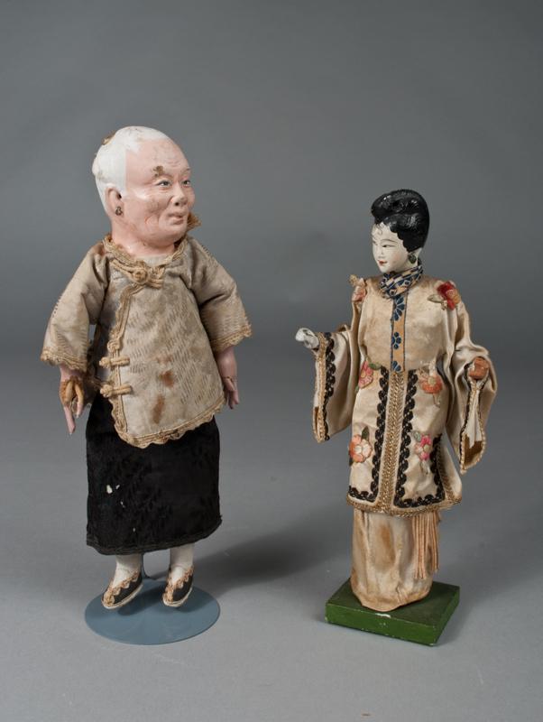 Each with hand stitched cloths and painted facial details, tallest is 11"H, circa 1900, clothing lightly soiled, both on stands.