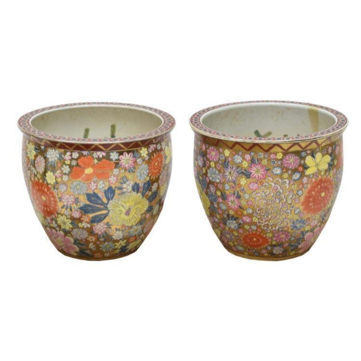 Description: (pair) Chinese famille rose parcel gilt enameled porcelain fish bowl, with polychrome 1000 flower design to exterior, goldfish and sea plants to interior, approx 15.75"h, 18.5"diam - 9234-021718-IN-410