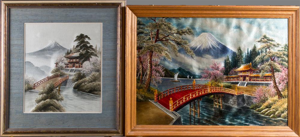 Finely sewn each to depict a landscape one with boats and water, the other a winter scene, both nicely framed largest is 23"H X 20"W circa 1940's or 1950's.