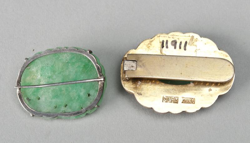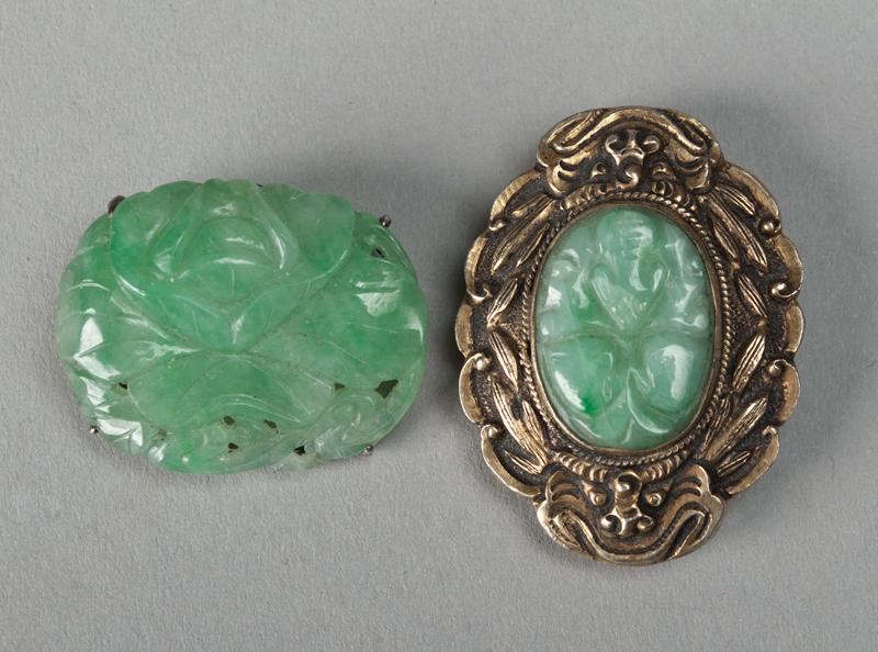 To include a apple green jadeite and gilt silver oval clip with impressed silver and china mark, together with a light apple green jadeite oval broach carved as a flower in a silver mount, both very well done, circa early 20th century, largest is 1.625"L.