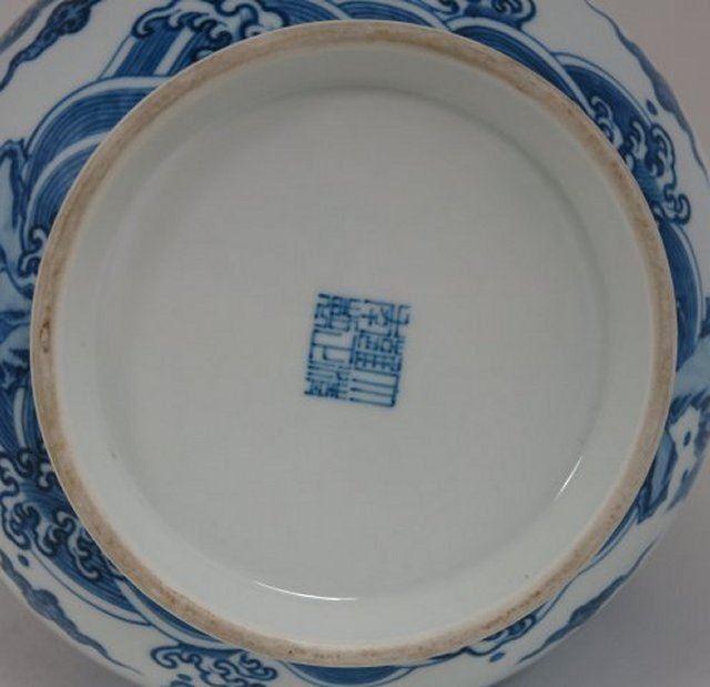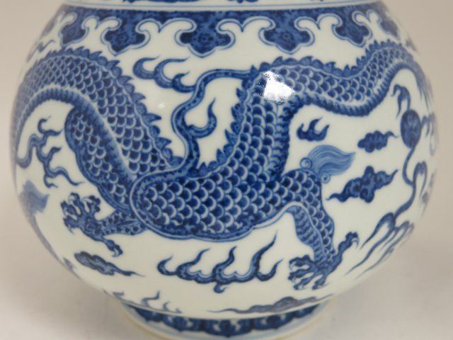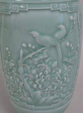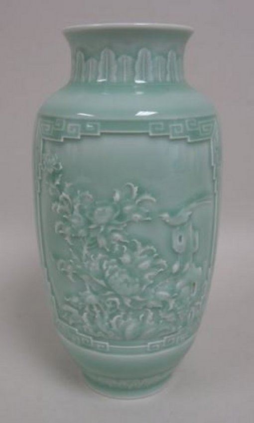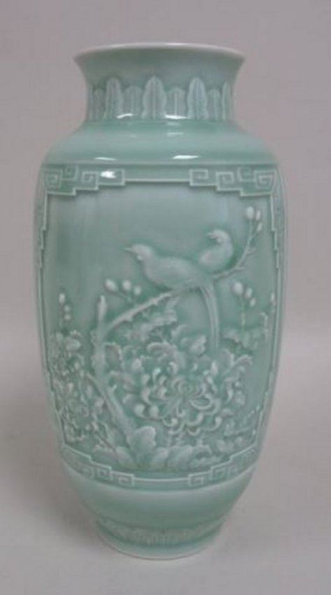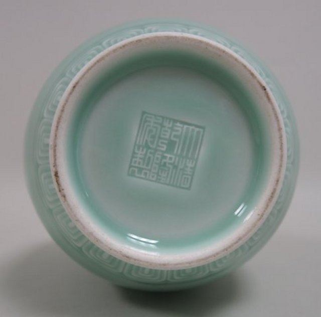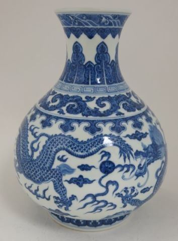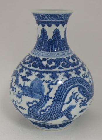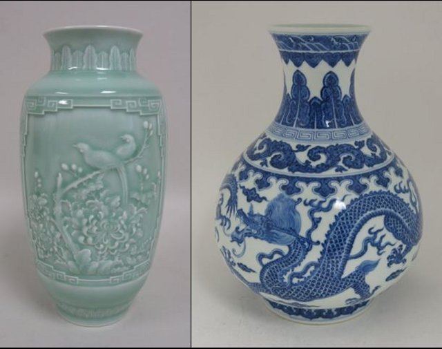 Chinese celadon porcelain vase with Qianlong mark, approx. 10" H. Chinese porcelain Yunhunchin vase, under glaze blue, dragon scene with Yong Zeng, approx. 12 1/2" H. Some hairlines on top of Yunhunchin vase.