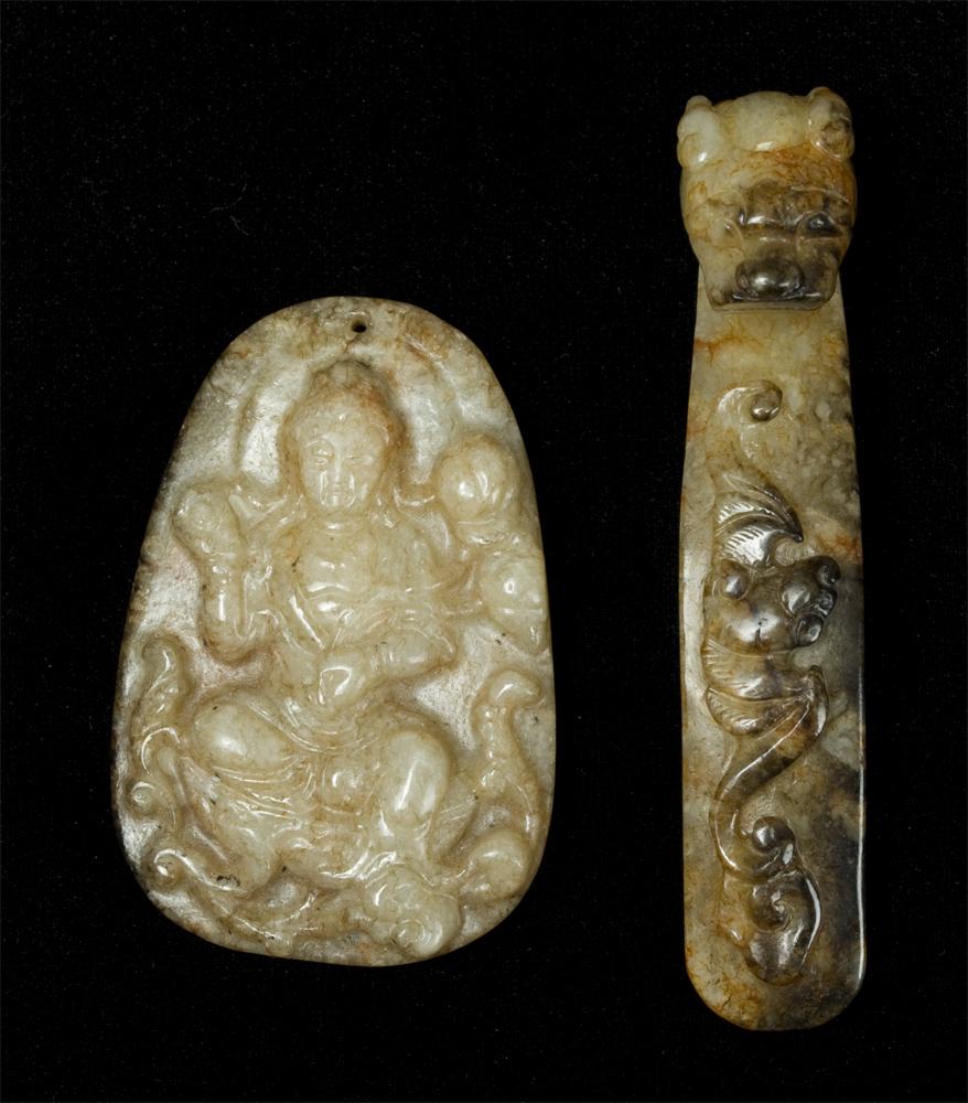 First finely carved to depict a Buddha on lotus base holding blossoms in green with russet inclusions, 2.5" L. Together with a ruyi sceptre belt hook finely carved to depict dragon head with other carved animal figure in green with russet and black inclusions, 3 & 3/8" L. Late 19th/Early 20th Century.