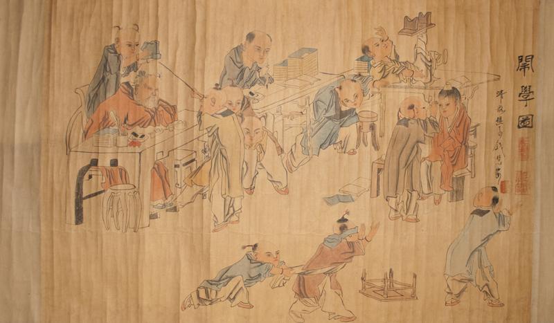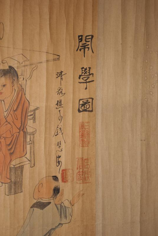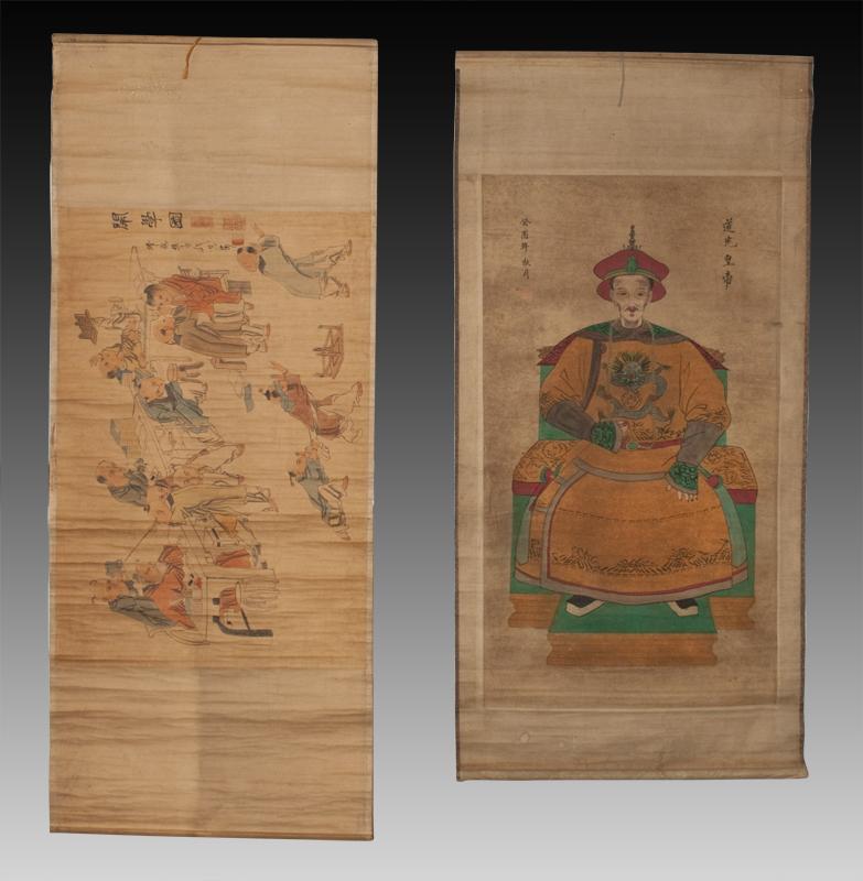 Both scrolls with printed landscape and calligraphy throughout, each with seal marks in red. Largest, 174.5" L, 20th century.