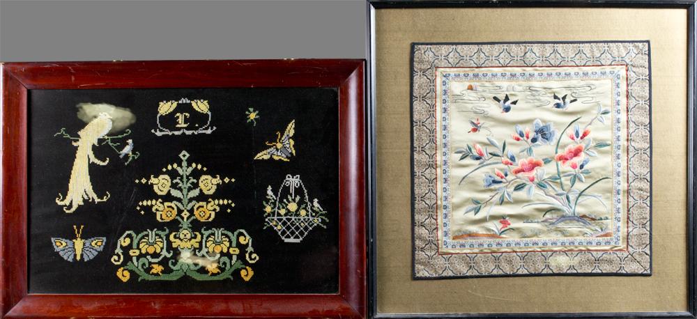One depicting a phoenix in gold thread against a blue background framed and mounted 10.5"H X 10.75"W sight framed and matted, together with an example finely sewn to depict fruit and vines 14"H X 12"W sight both circa late 19th-early 20th century.