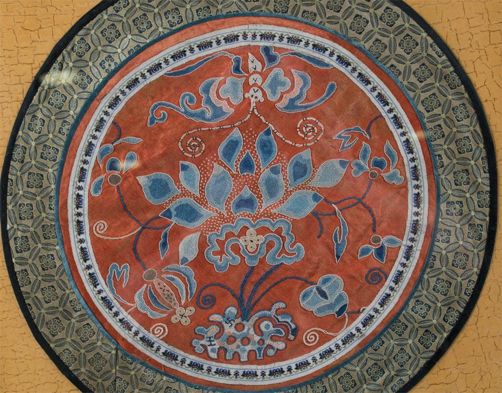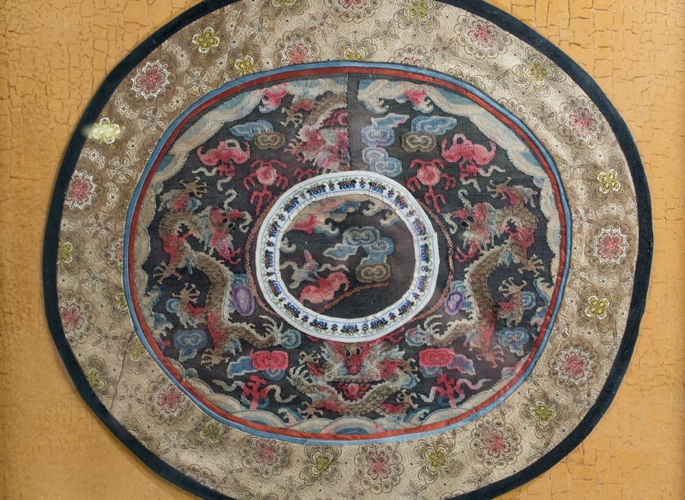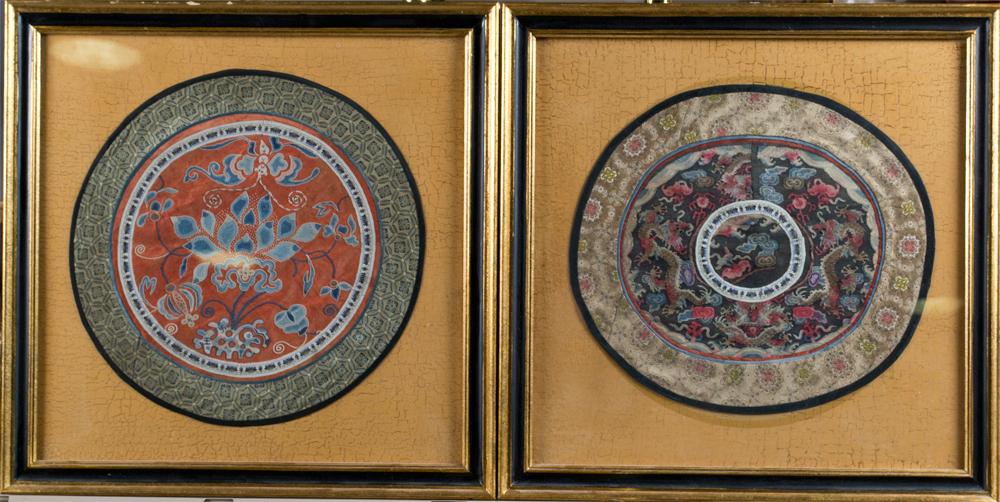 One finely sewn to depict dragon amongst ruyi clouds the other sewn to depict symbols both in circular form, 11.25"D each both nicely framed and matted circa early 19th century.