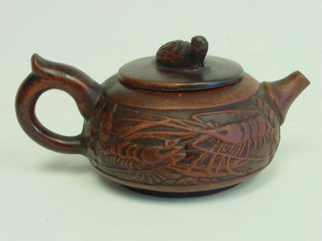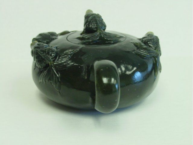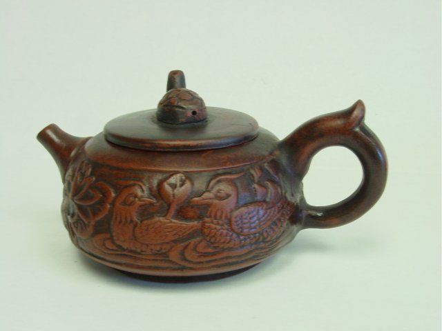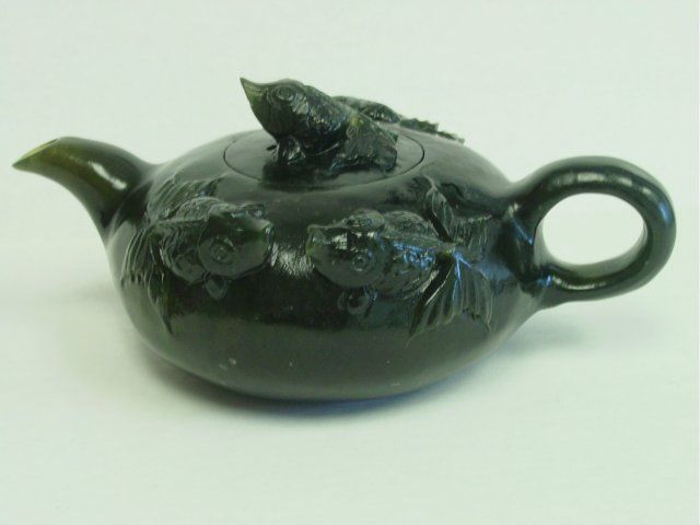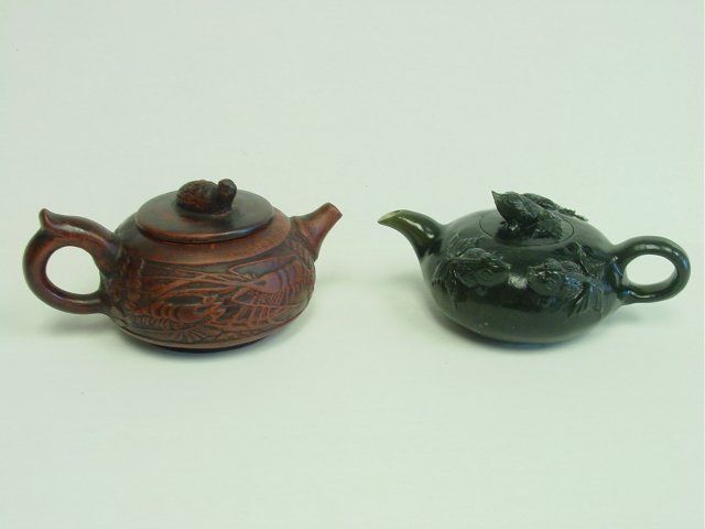 1- Chinese jade teapot, approx. 5" L. 1- Zisha relief carved teapot, depicting "Birds & Turtles", approx. 5" L. Please read our terms of sale.