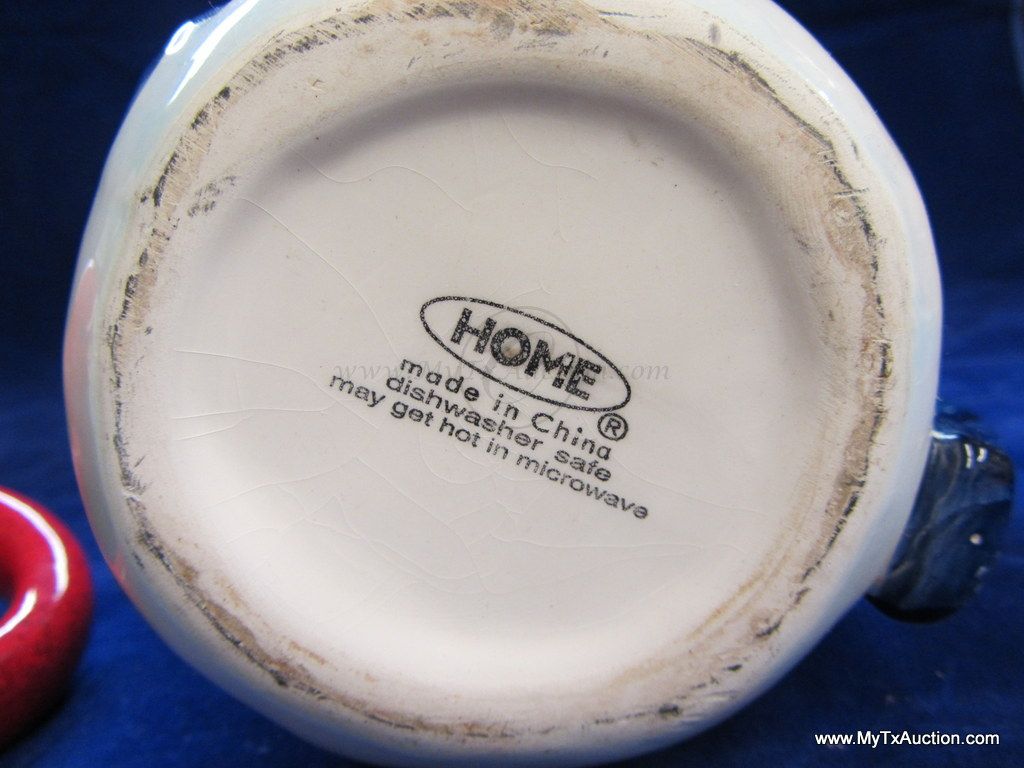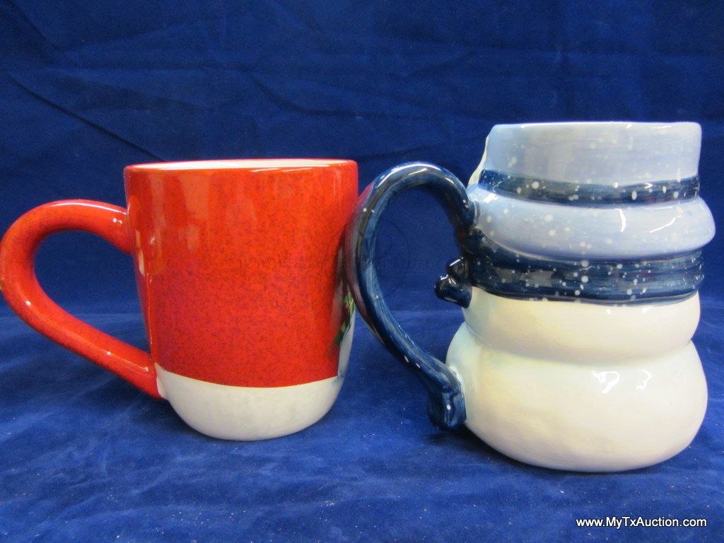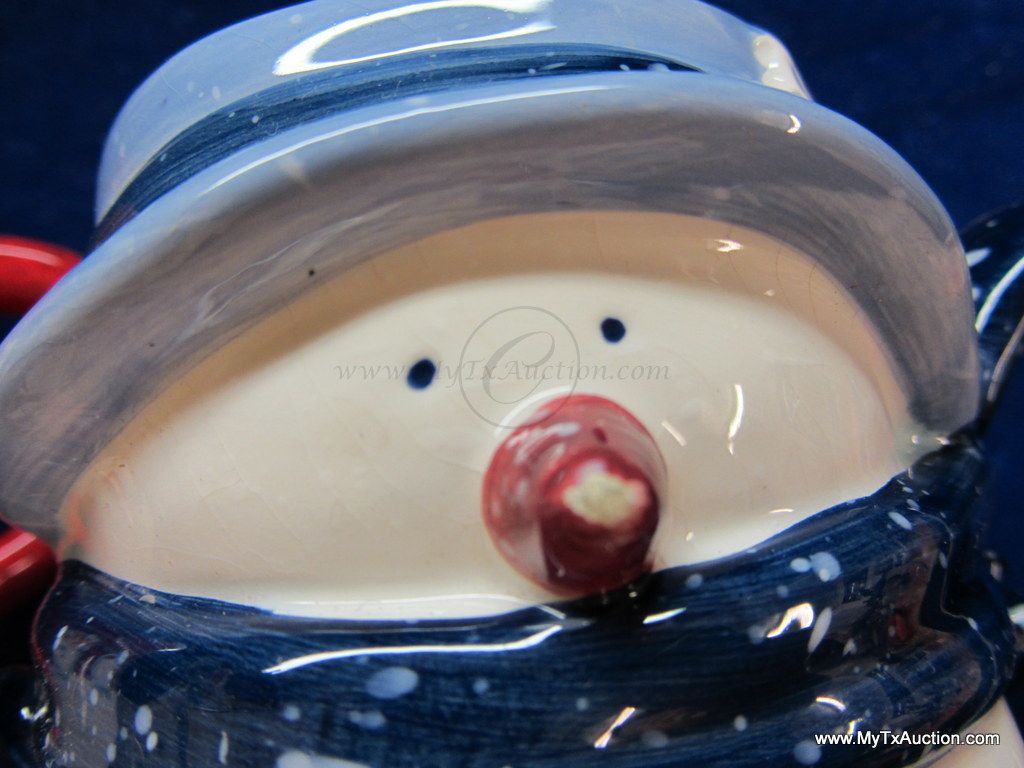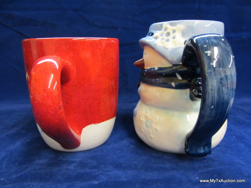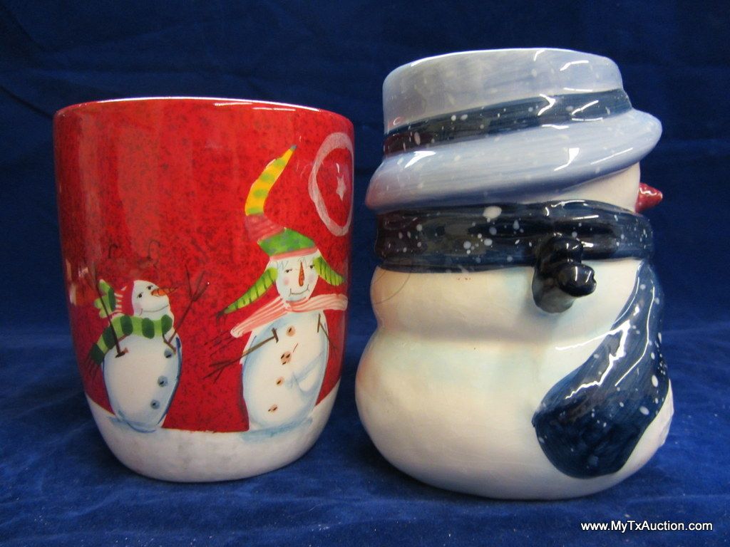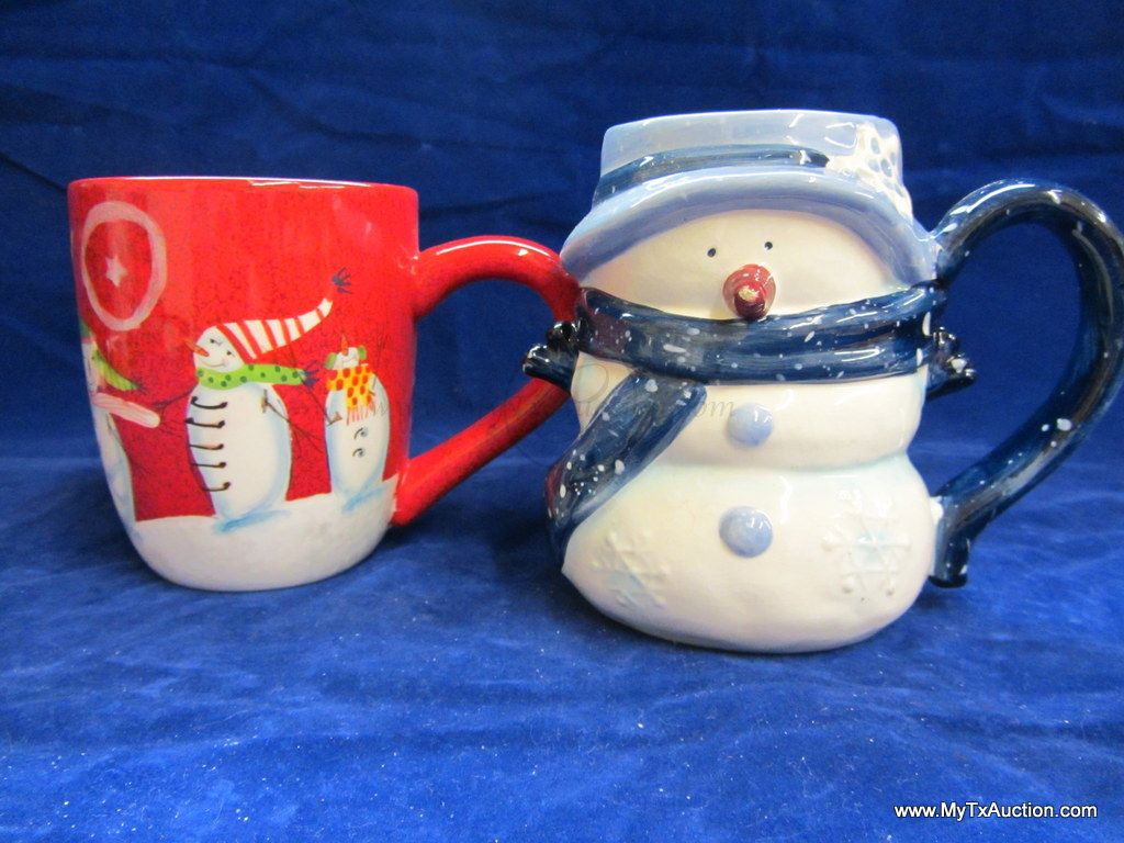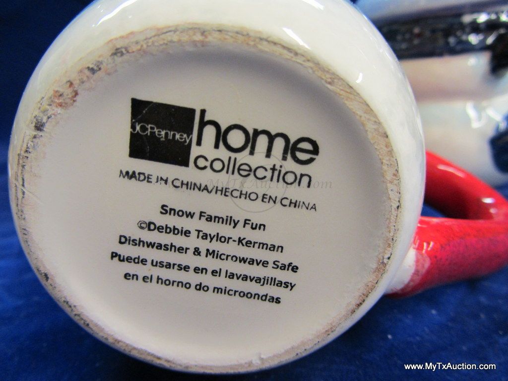 2 snowman coffee cups. 1 by JC Penny Home Collection has a picture of a family of 4 snowmen and 1 by HOME is a blue snowman this is an older mug NOTE: crazing is visible on the bottom of the cup and the snowman's carrot nose is missing some paint it is not broken just missing paint/glazing