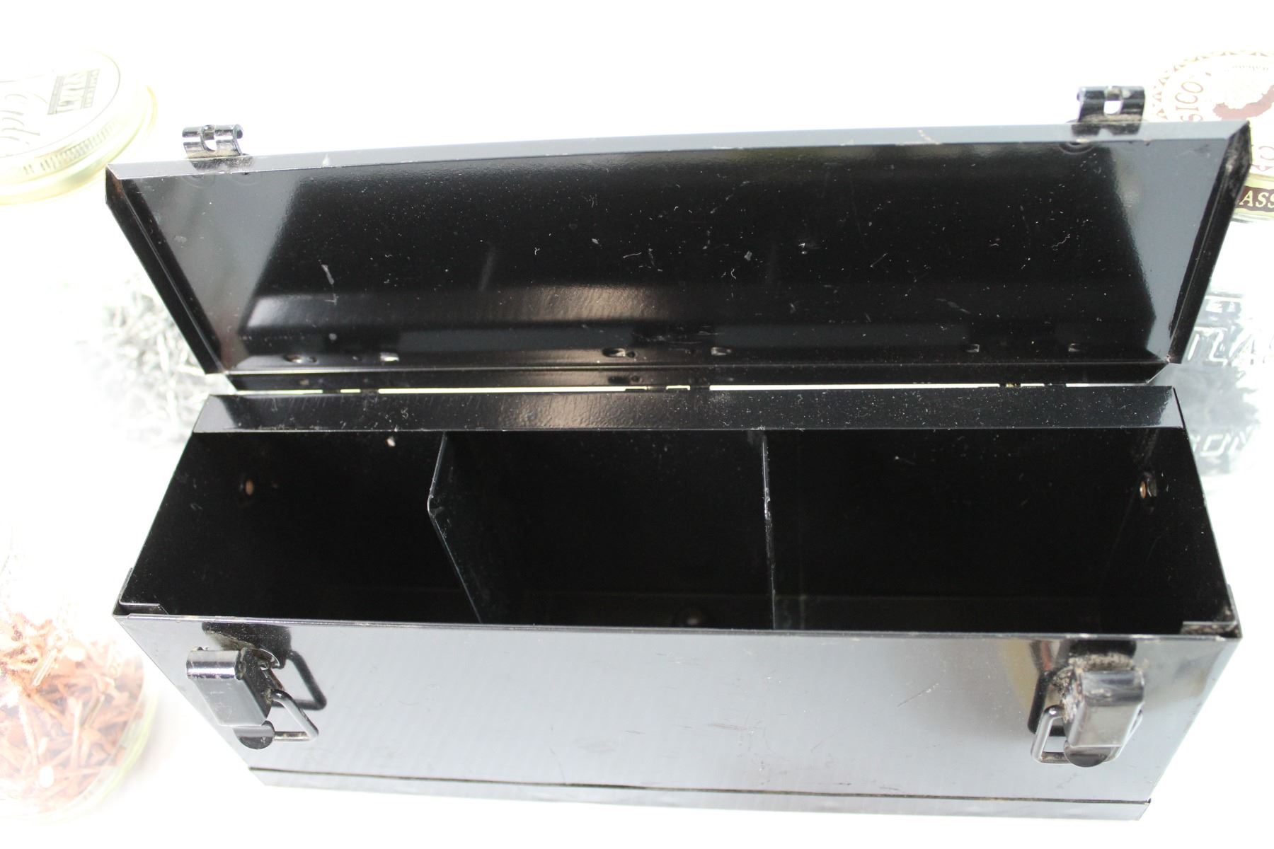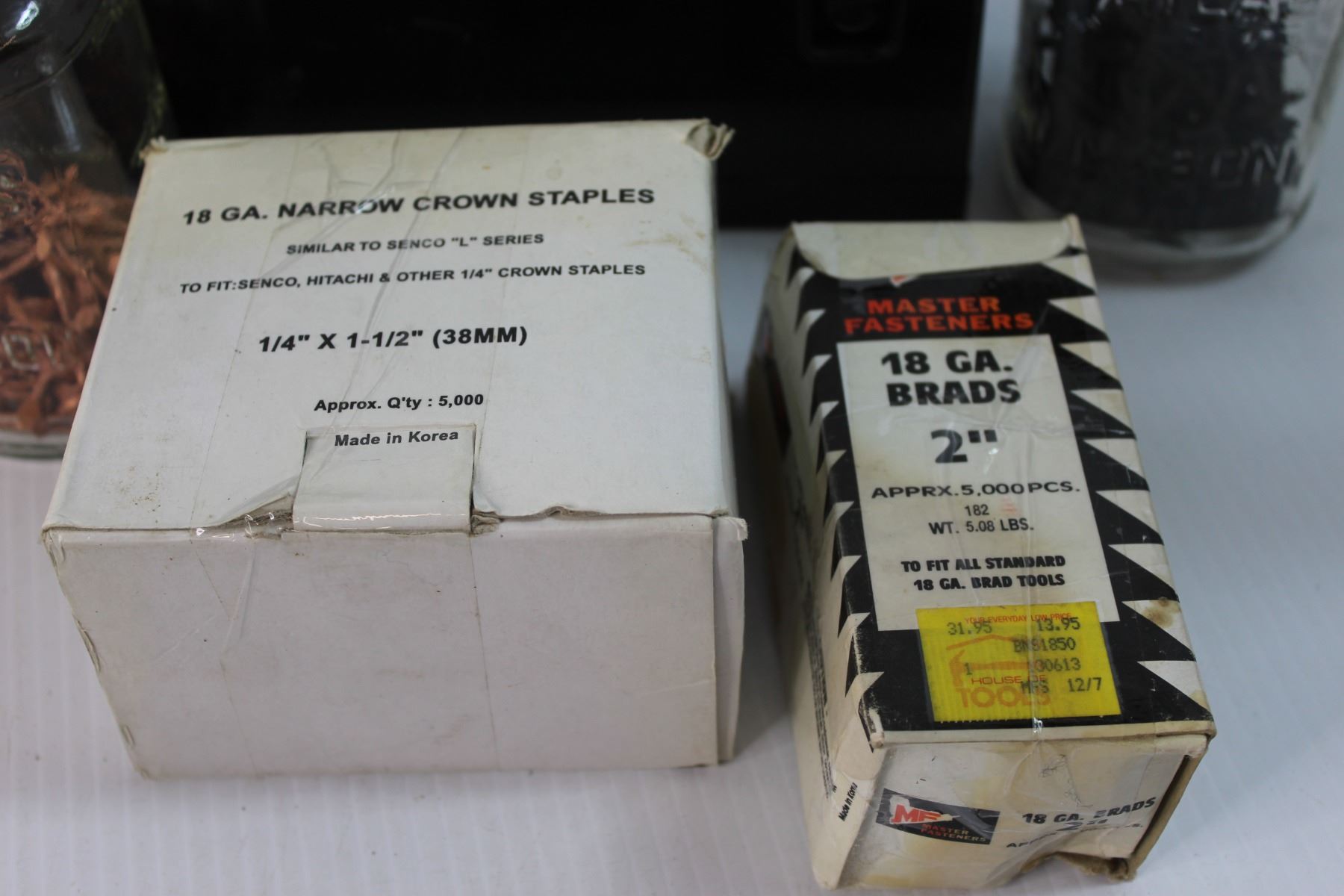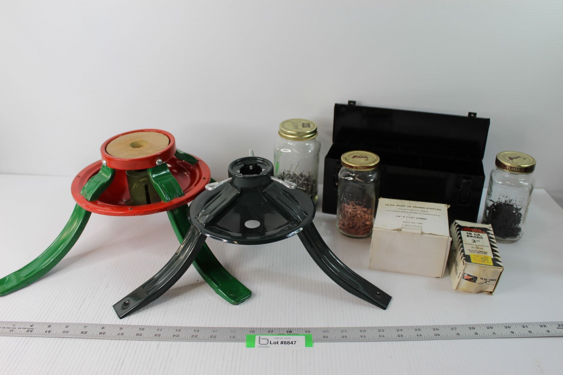 (2) Christmas Tree Stands, Metal Storage Box, (3) Jars of Nails & Phillips Screws, 1.5"x1/4" Staples, 2" Brad Nails