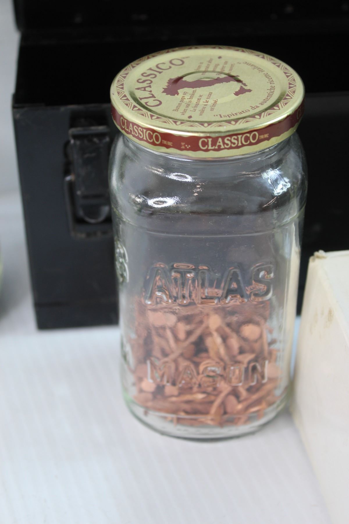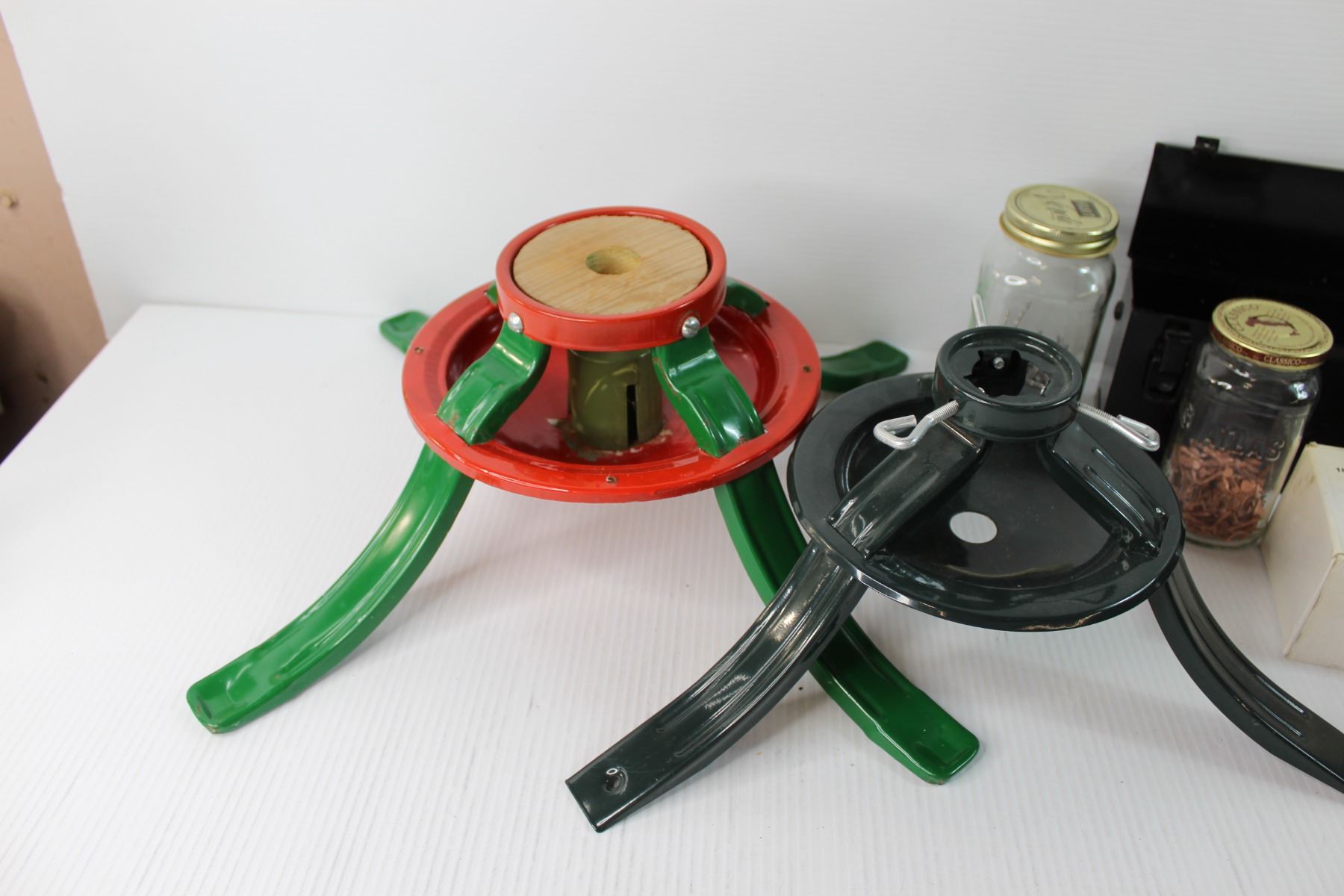 (2) Christmas Tree Stands, Metal Storage Box, (3) Jars of Nails & Phillips Screws, 1.5"x1/4" Staples