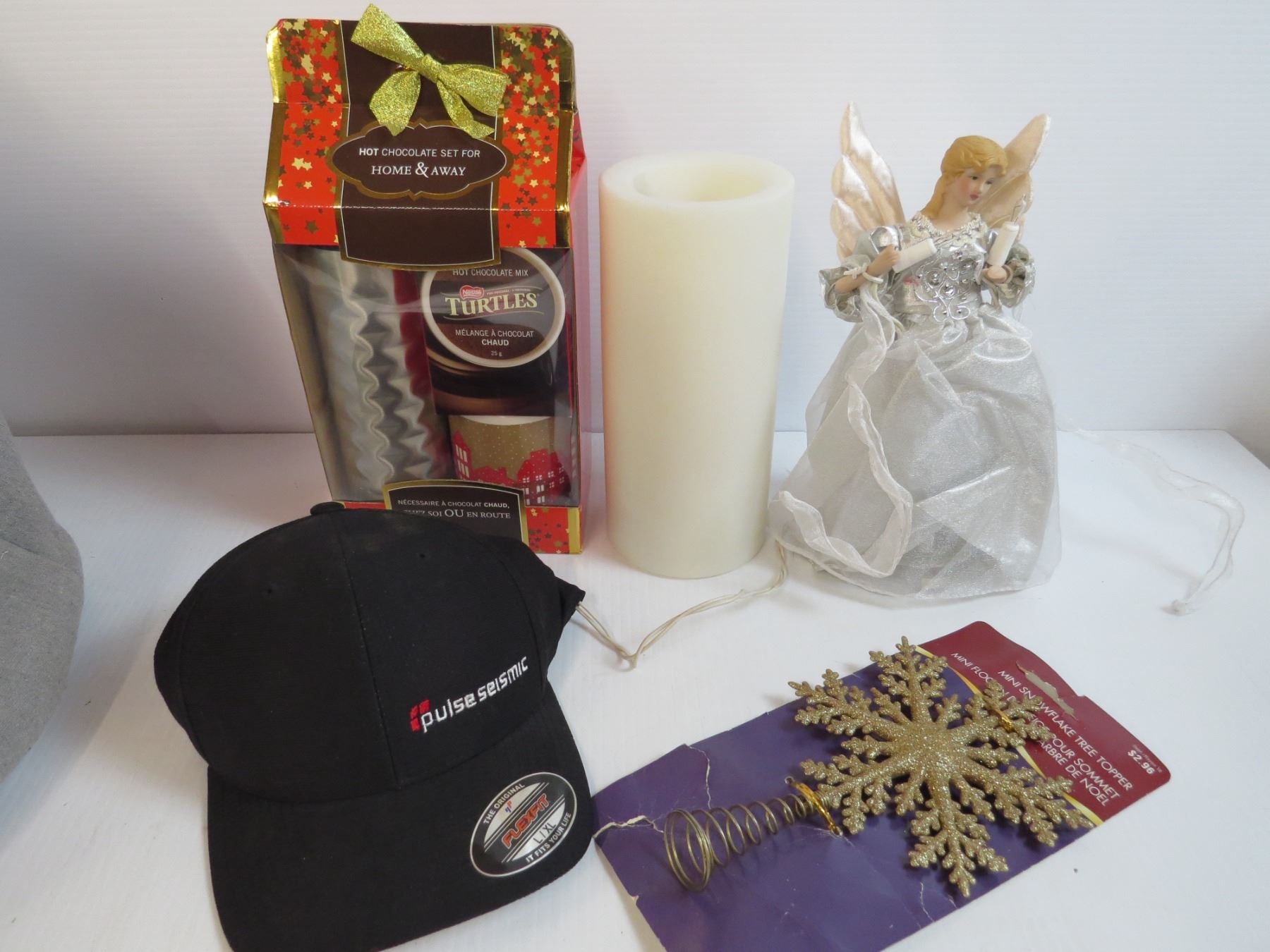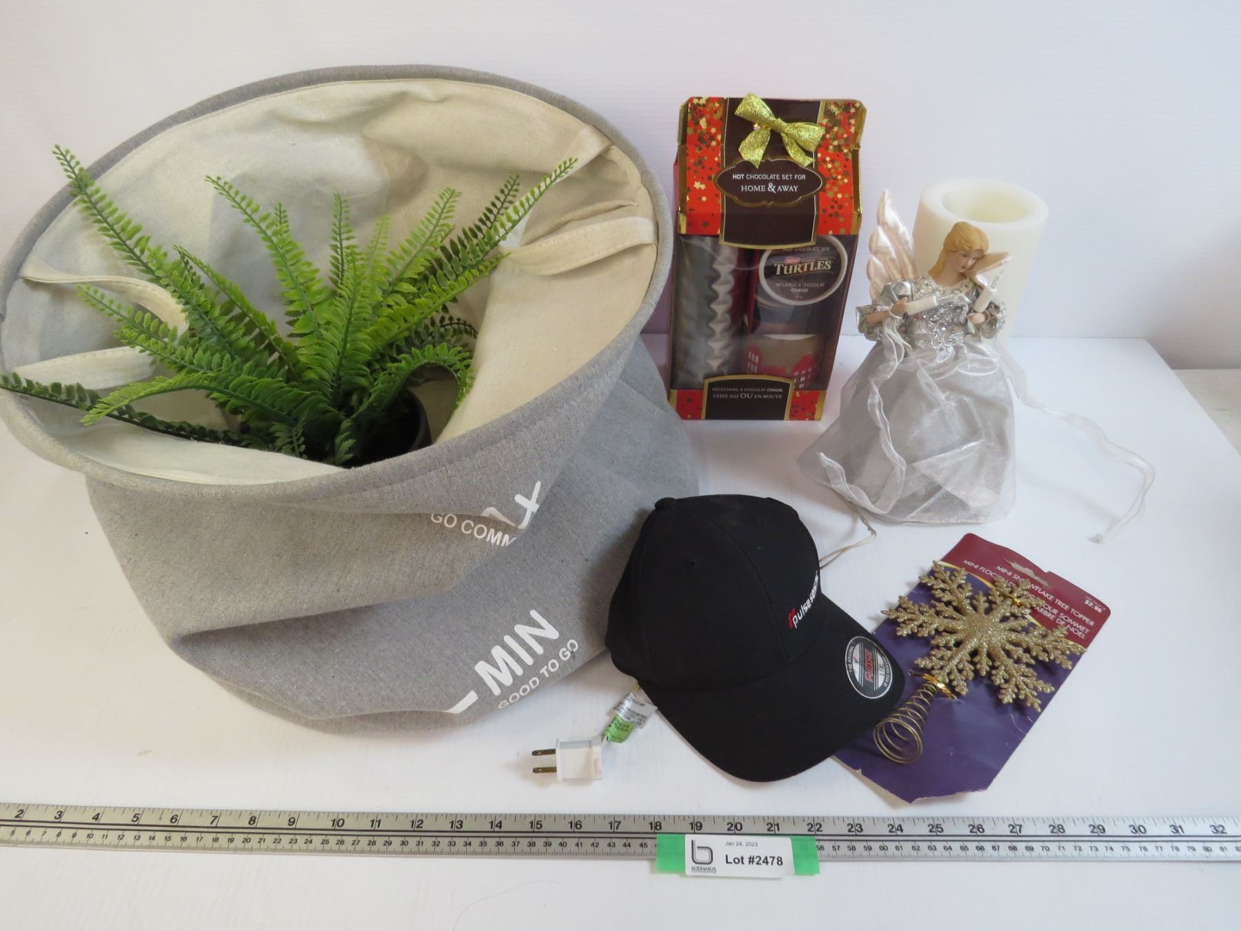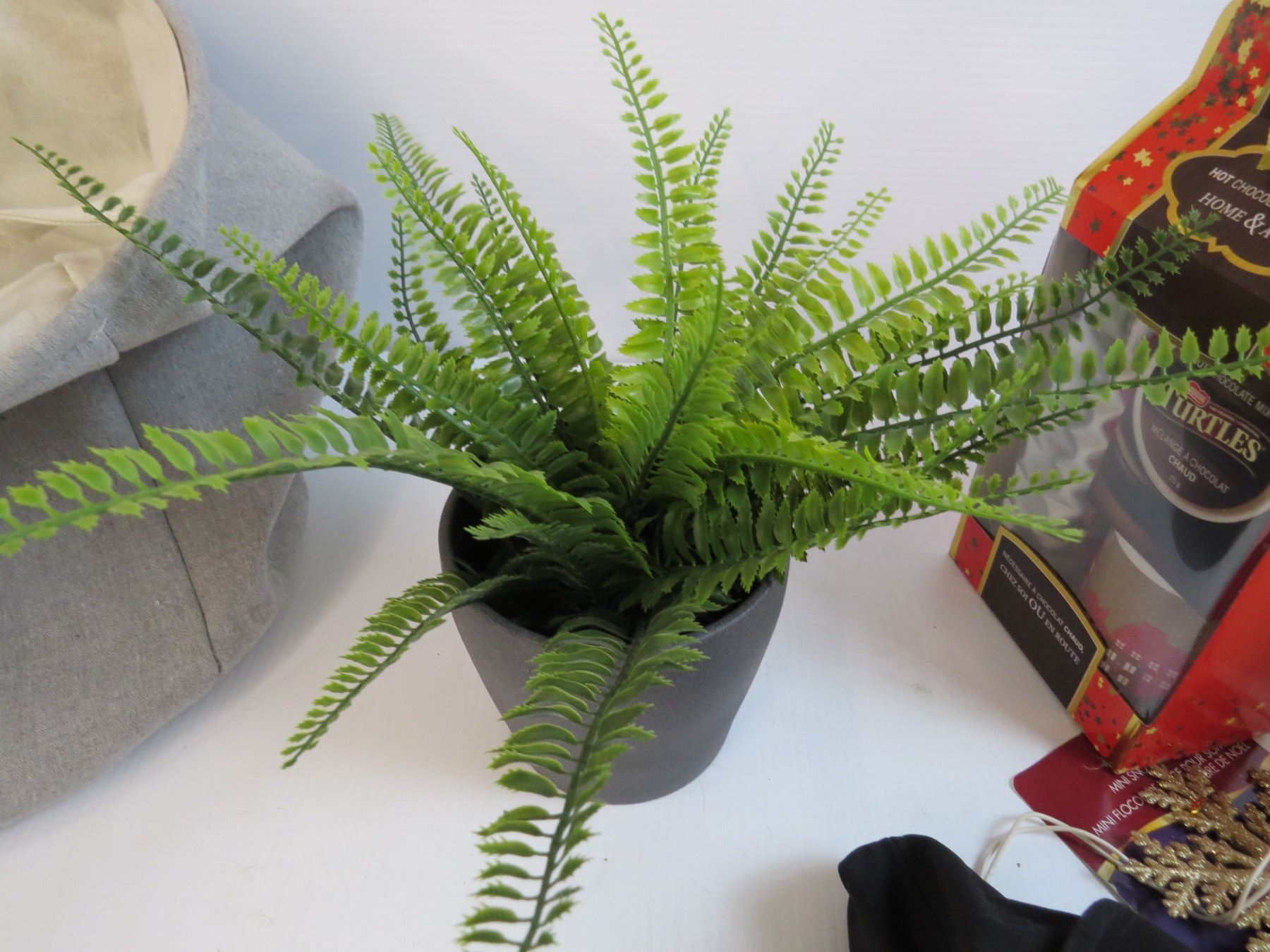(2) Christmas Tree Toppers - Laundry Basket - Fake Fern - Turtle Hot Chocolate Kit - Hat - Candle