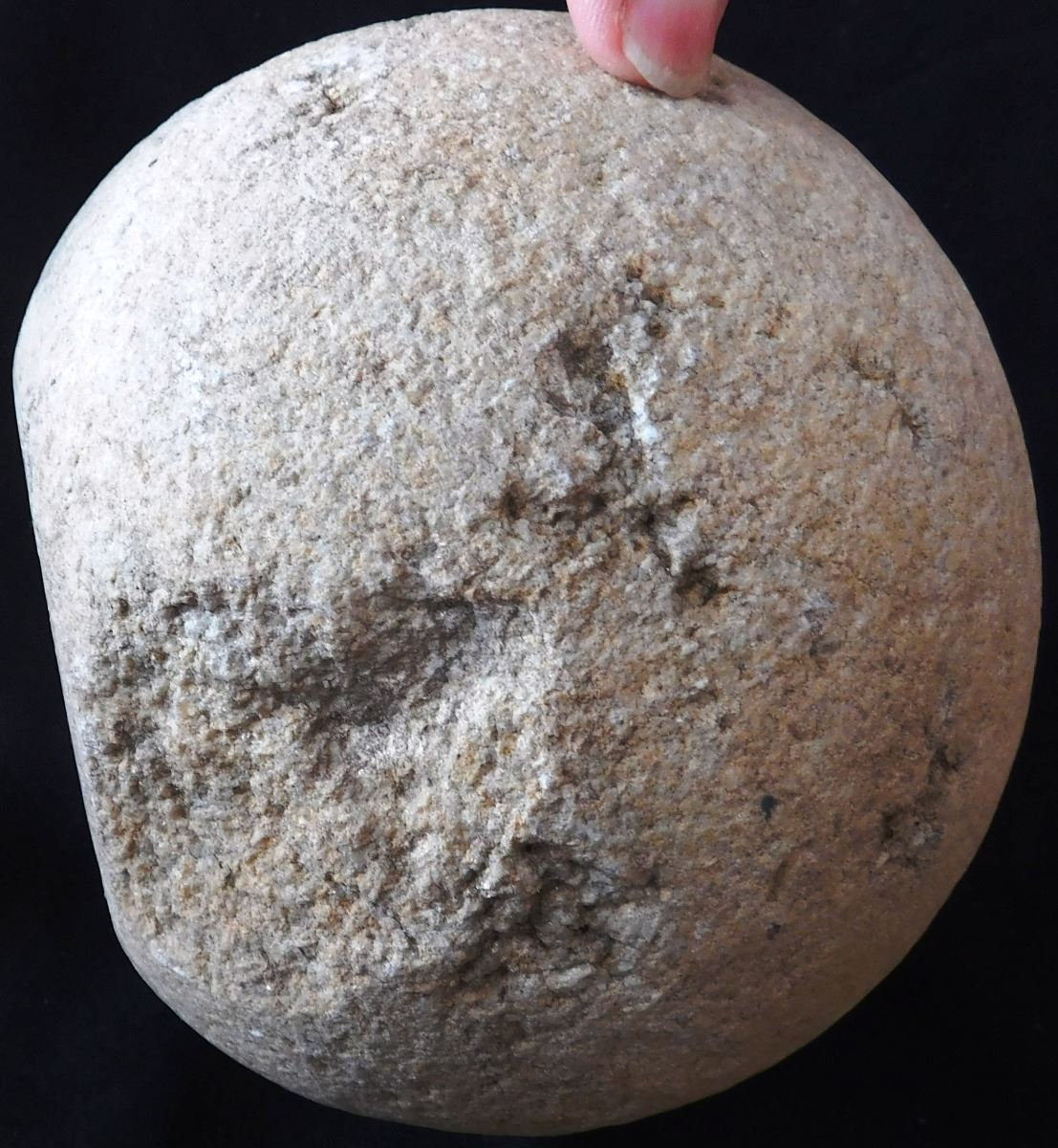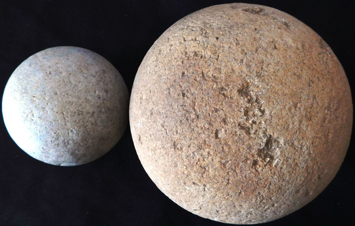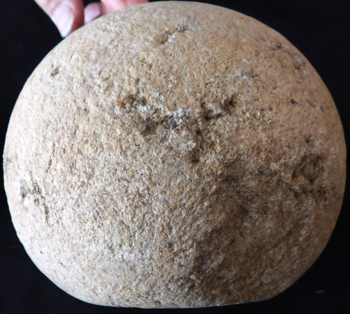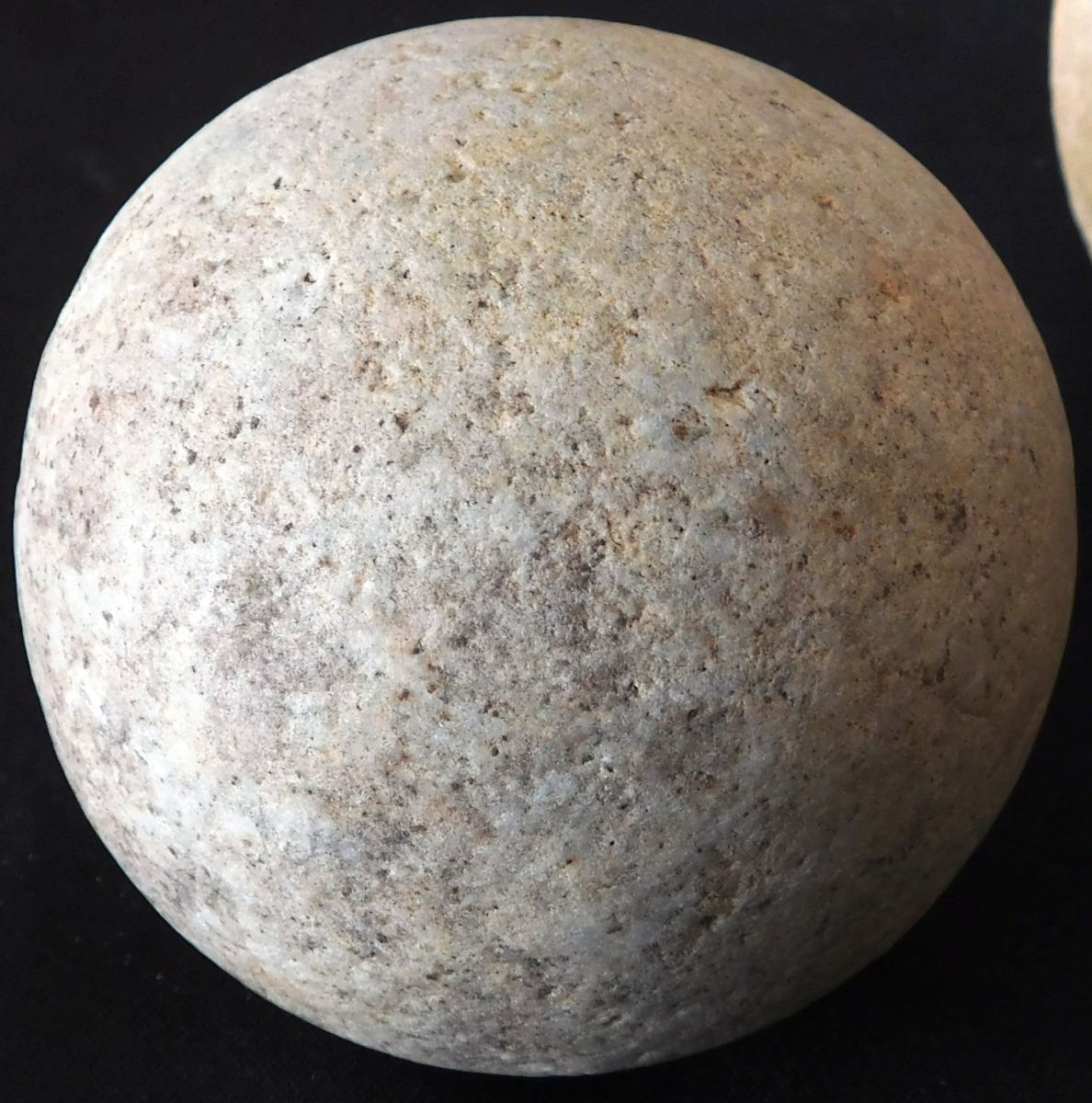 2 Chumash Gameballs, pre-historic items. Made of quartzite, items measure 3.5" and 5.5". From Santa Barbara County, Calif. Balls found together in the 1960s. Both stones have a flat bottom. Found on a campsite near Goleta, CA. Condition: Larger gameball has chip on bottom, see images. Shipping: $32.50.