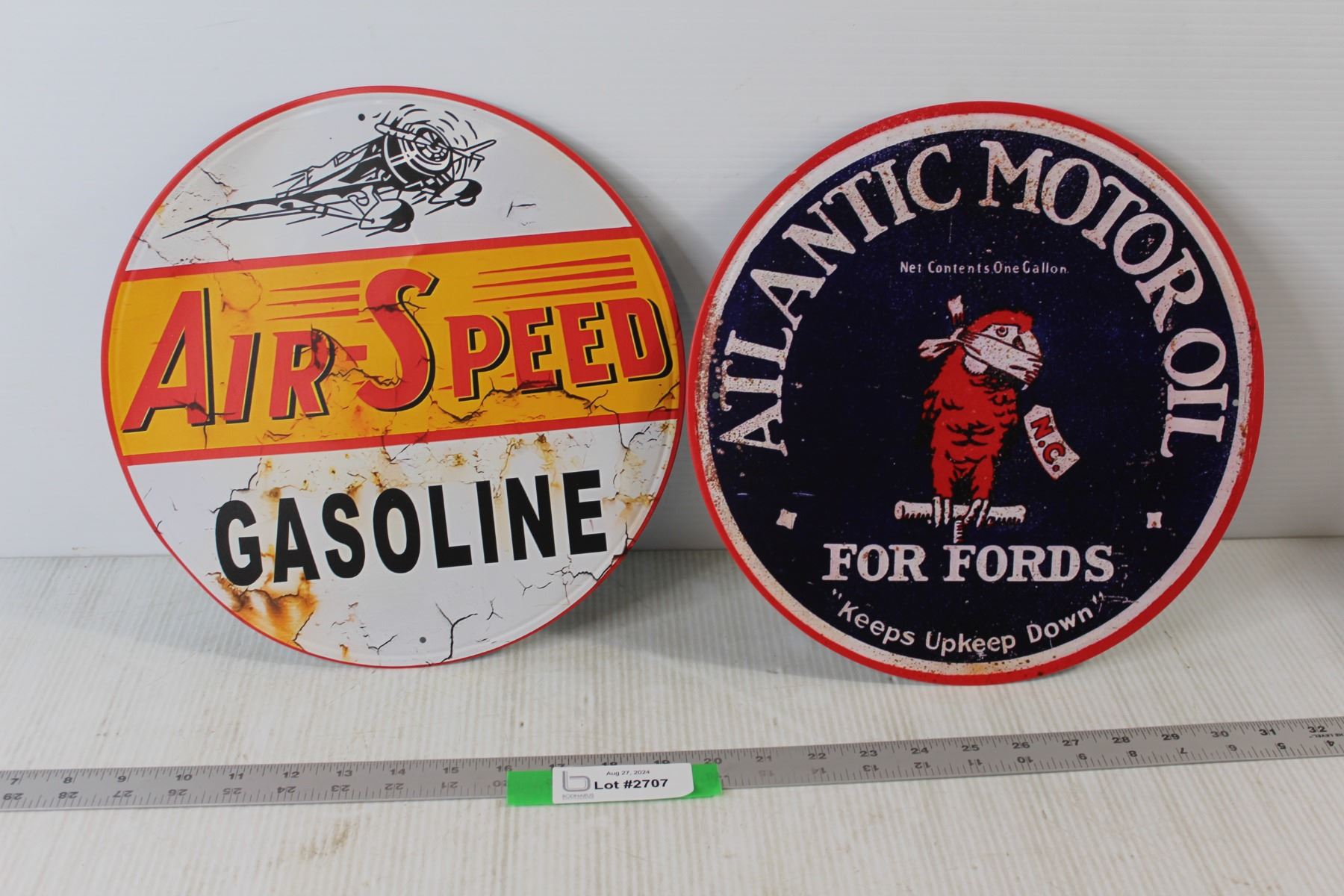 (2) Circular Metal Signs: Air-Speed Gasoline, Atlantic Motor Oil For Fords