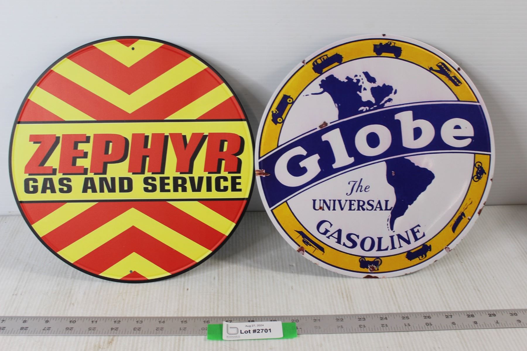 (2) Circular Metal Signs: Zephyr Gas and Service, Globe The Universal Gasoline