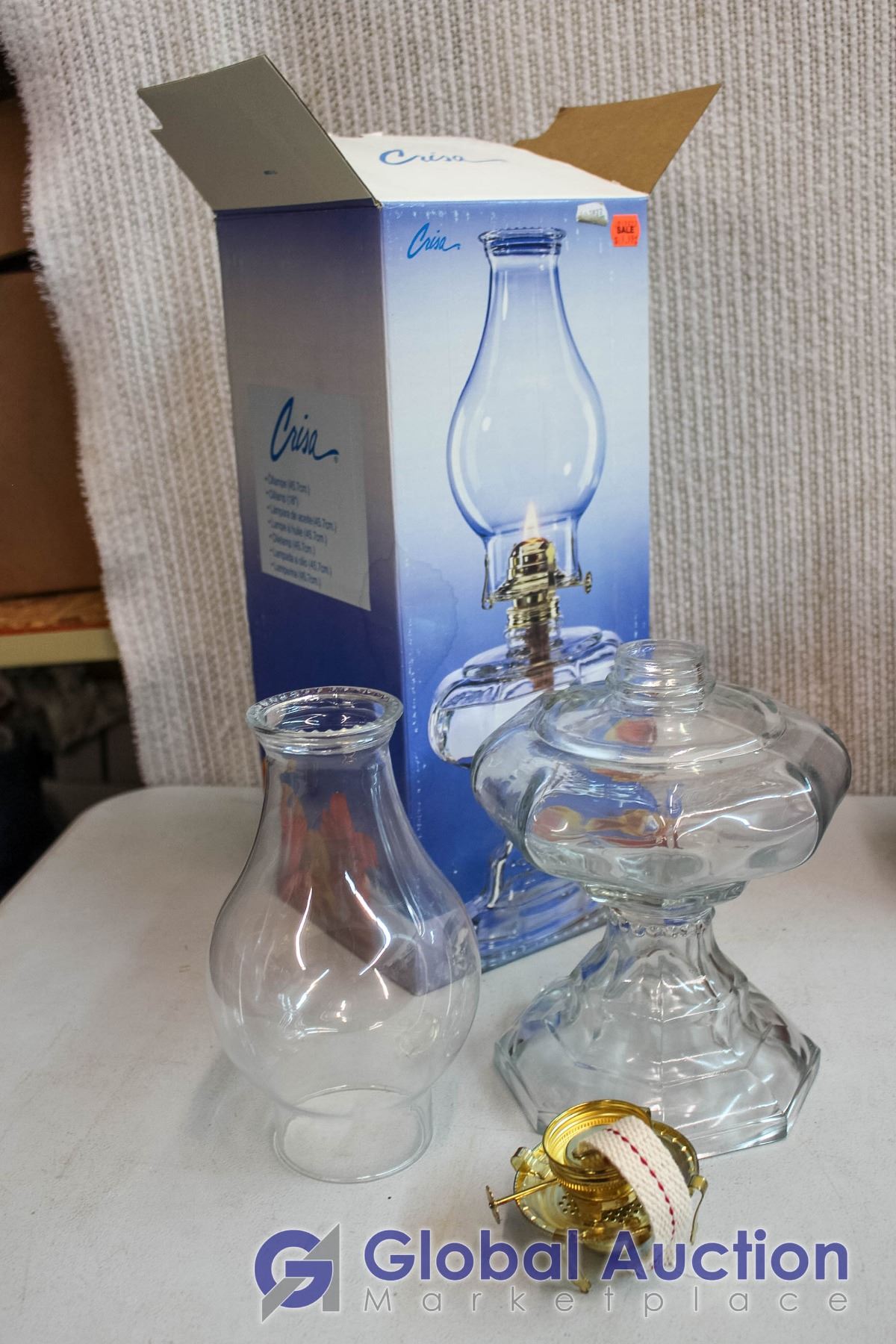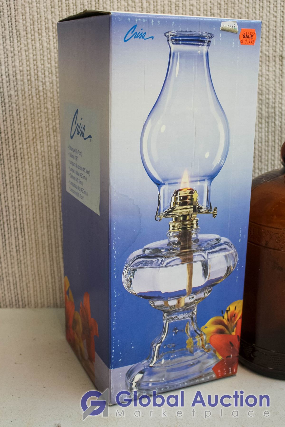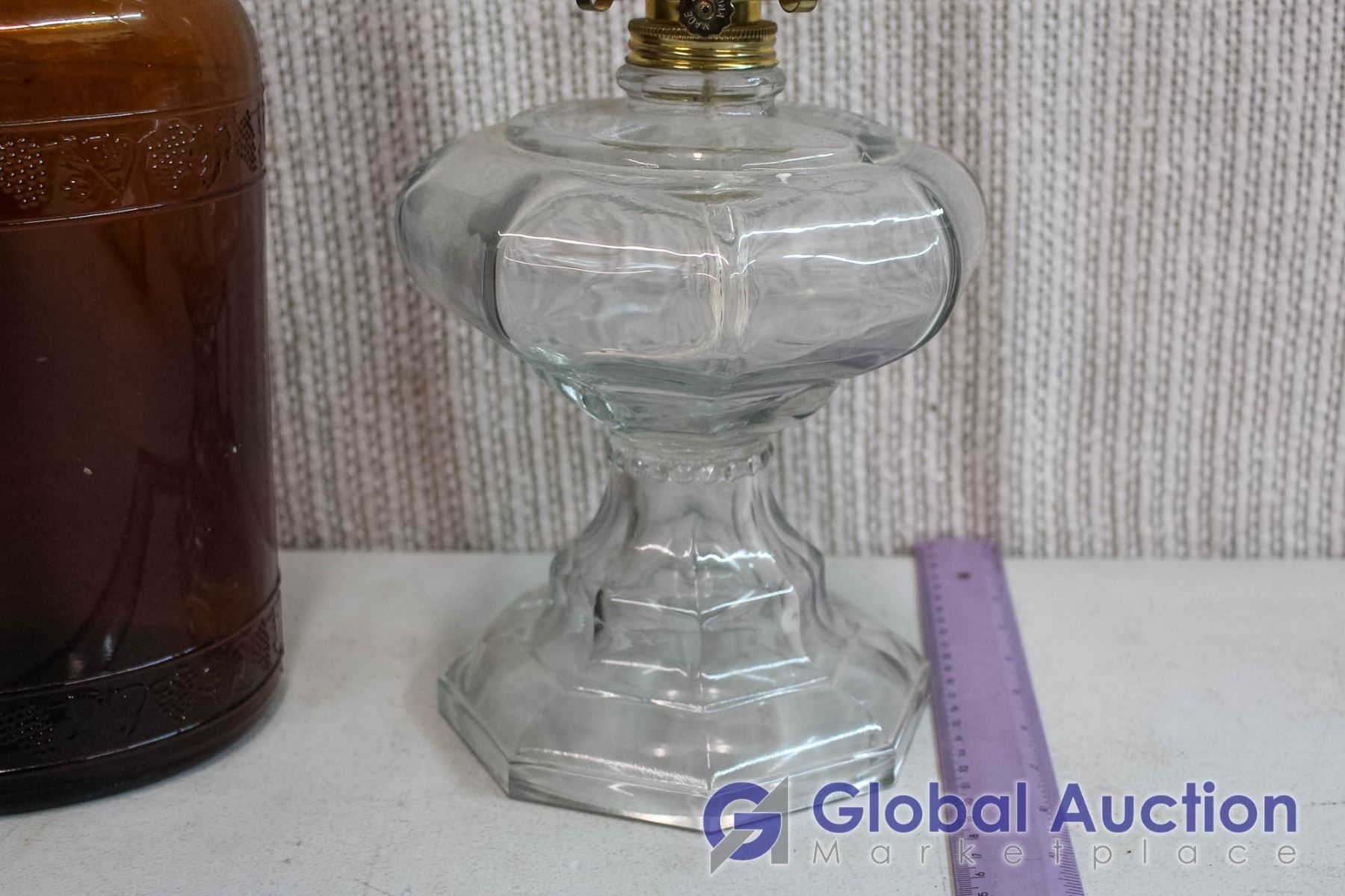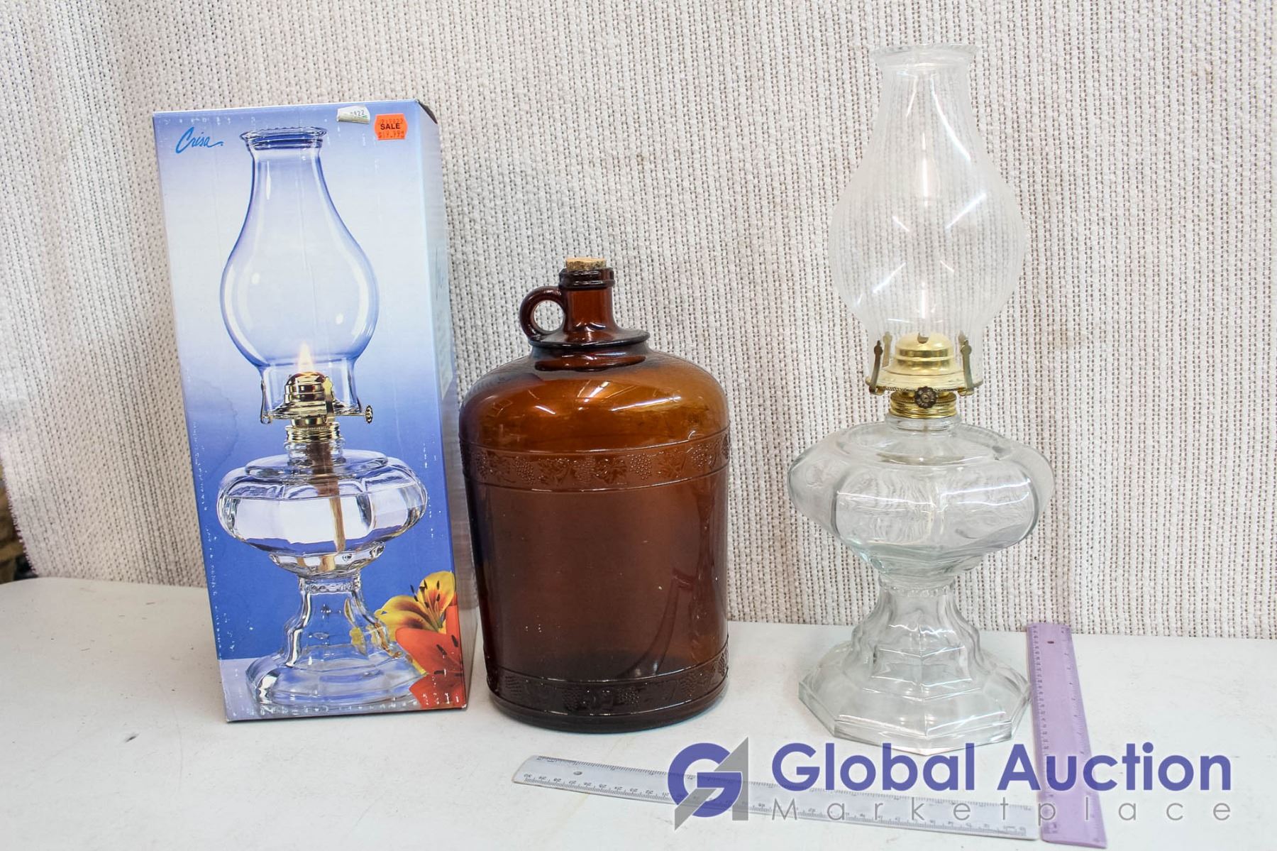 (2) Coal Oil Lamps (1 in Box) & Brown Glass Jug with Cork
