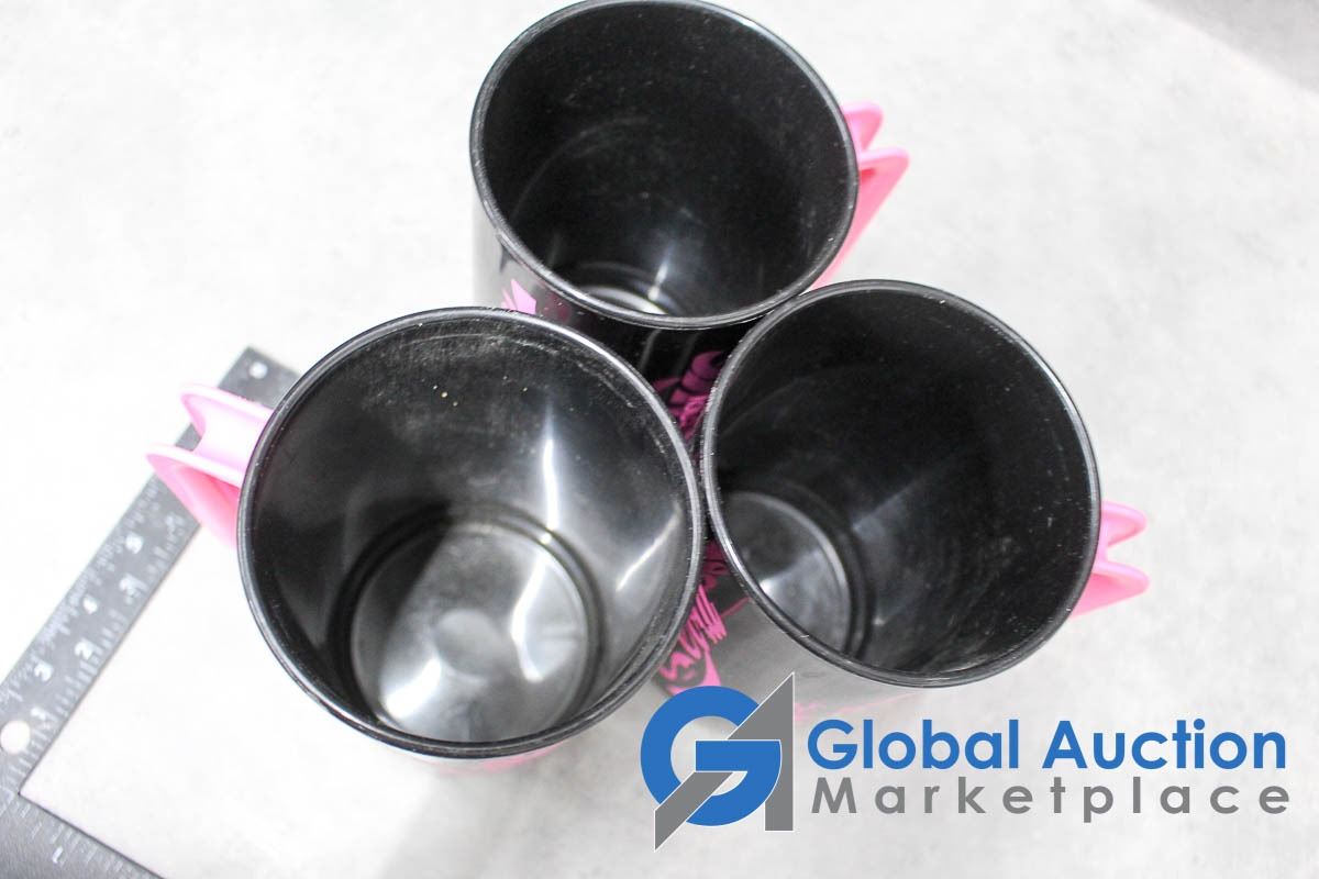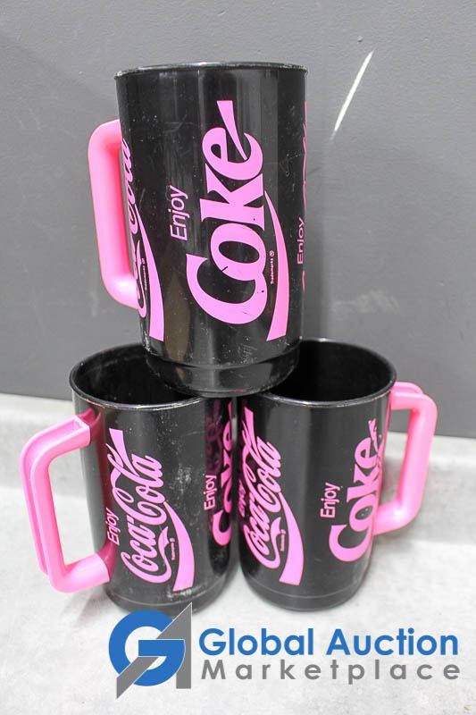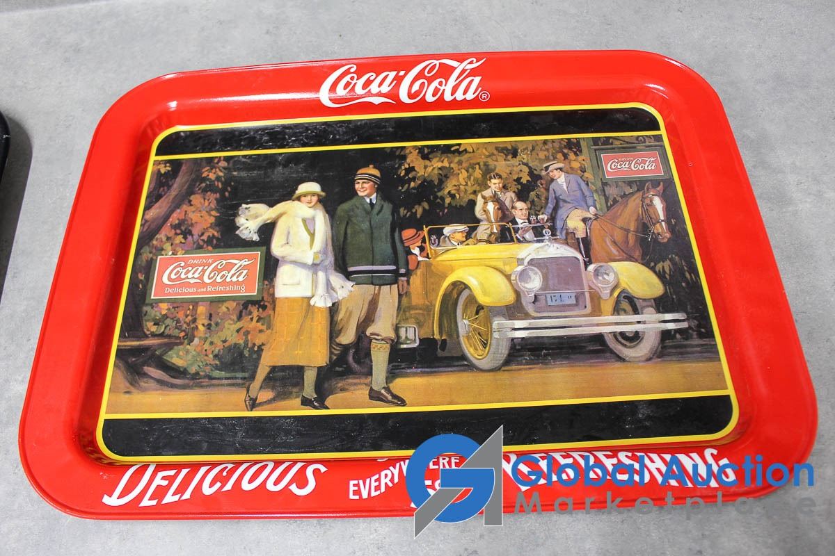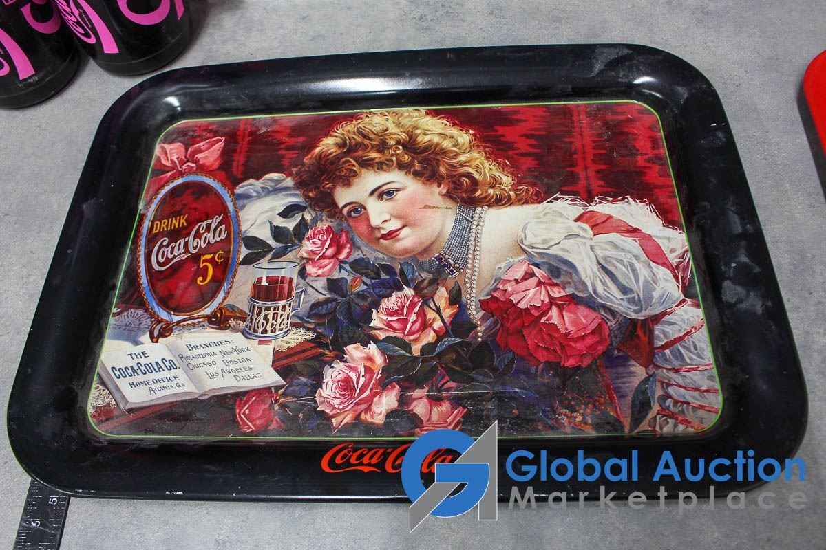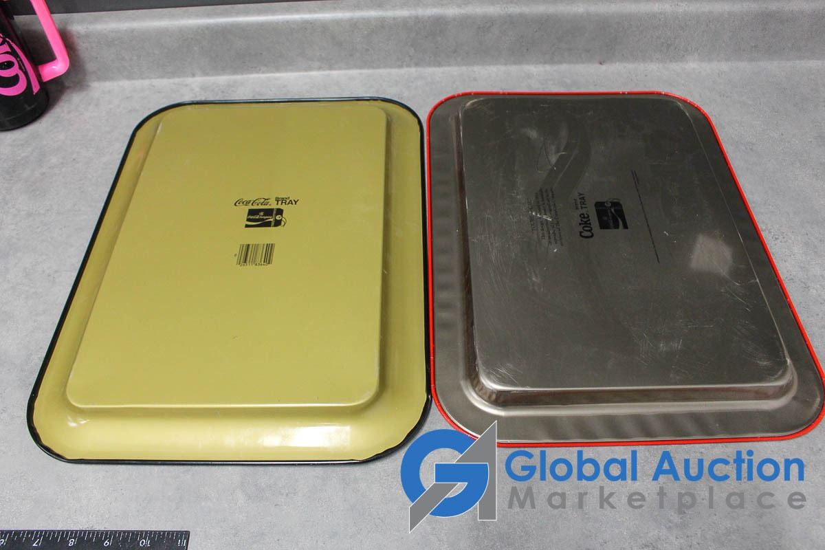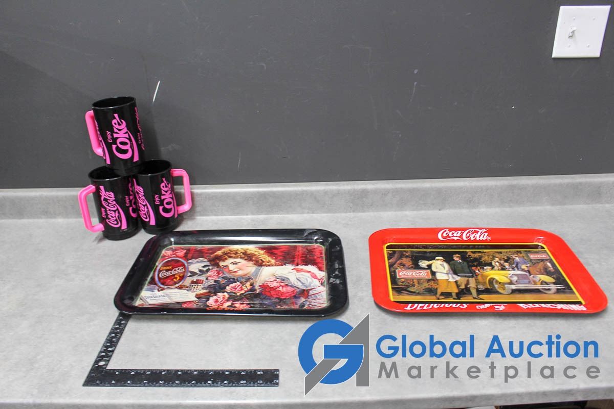 (2) Coca Cola Tin Trays & (3) Plastic Coca Cola Drinking Cups w/ Handles
