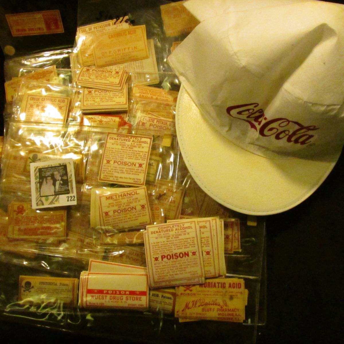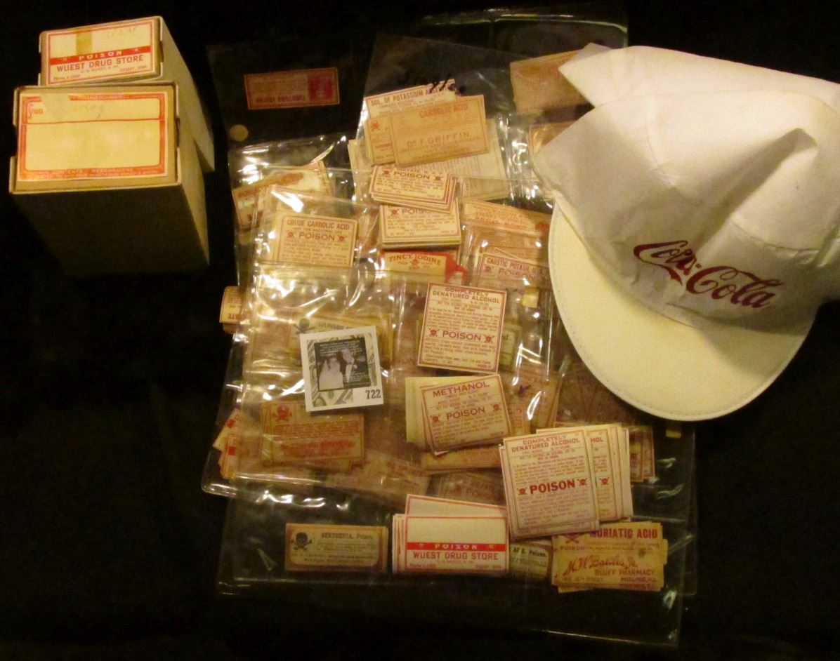 (2) "Coca-Cola" White caps with red lettering; couple pharmaceutical boxes with labels; & a huge group of Pharmacy labels which "Doc" would sell at "40 diff. $125.00".