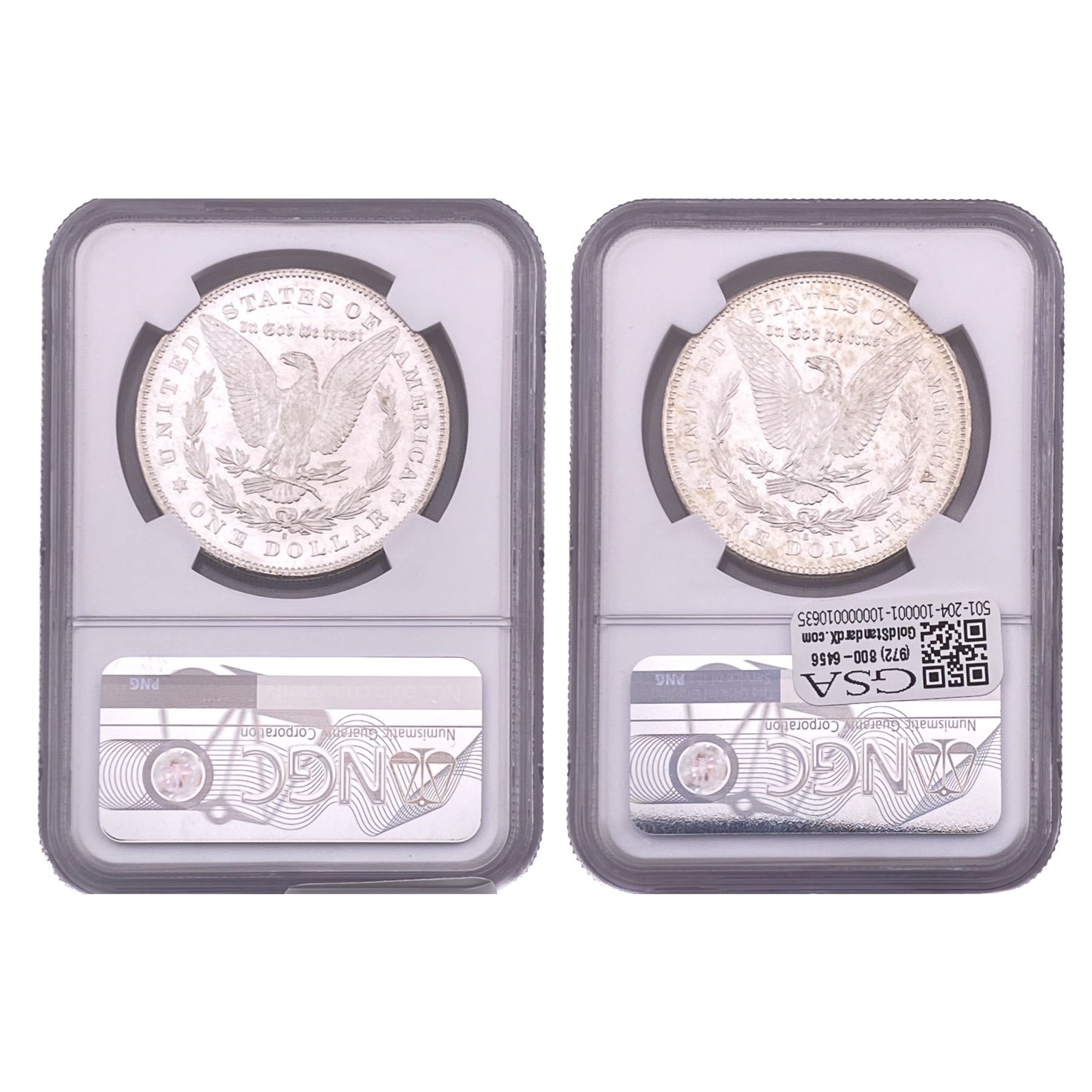 e. Coins sold referencing a third-party grading service are sold “AS IS” without any express or implied warranty, except for a guarantee by GSA that they are genuine. Removal or alteration of the holder, voids all of Bidder’s claims concerning that Product. Certain warranties may be available from the grading services and Bidders are referred to them for further details: Numismatic Guaranty Corporation (NGC), PO Box 4776, Sarasota, FL 34230, www.ngccoin.com/services/writtenguarantee.asp; Professional Coin Grading Services (PCGS), PO Box 9458, Newport Beach, CA 92658, www.pcgs.com/guarantee.html; ANACS, 6555 S. Kenton St., Ste. 303, Englewood, CO 80111; and Independent Coin Grading Co. (ICG), 7901 East Bellview, Ave., Suite 50, Englewood, CO 80111.