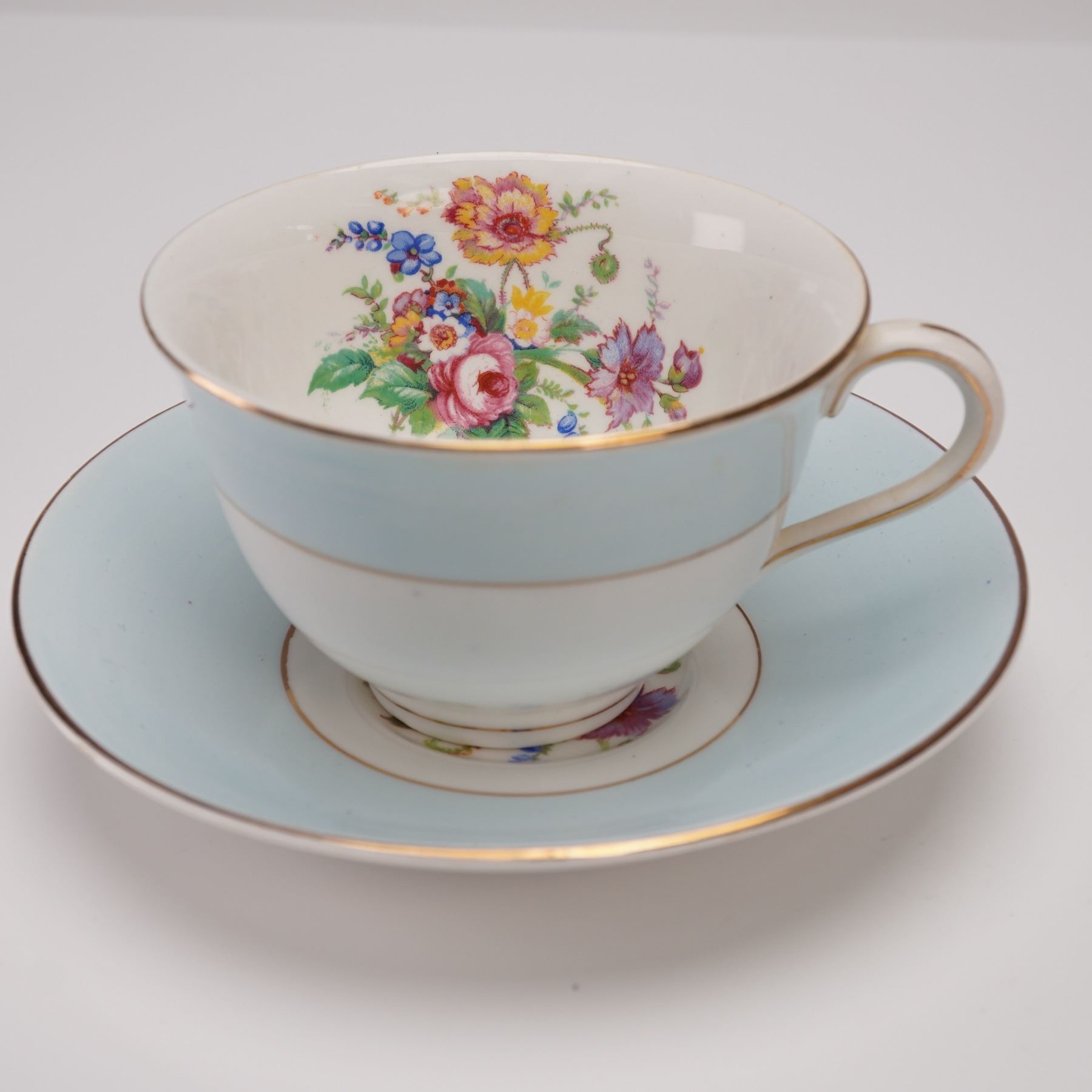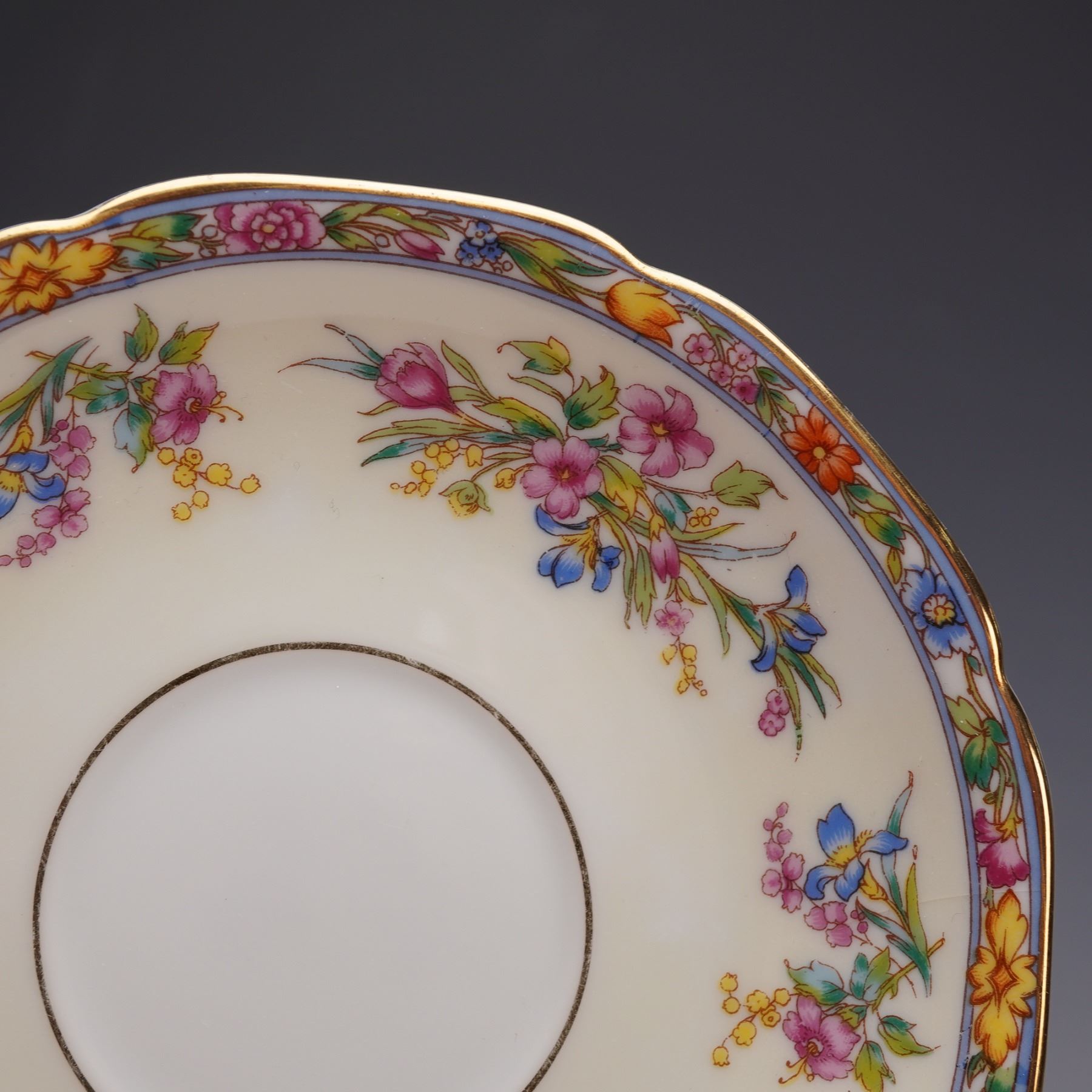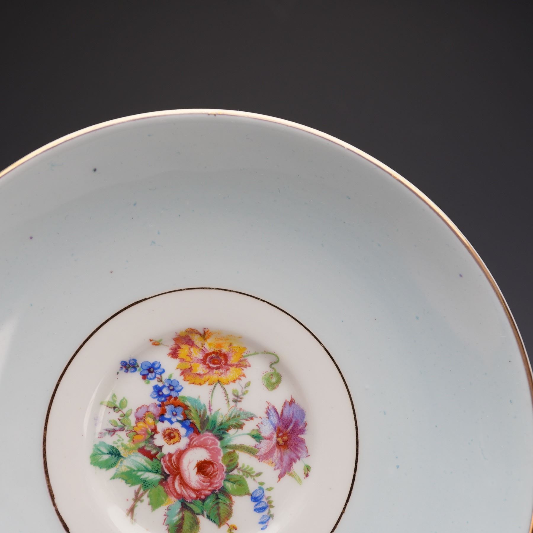 This pair of vintage teacup and saucer sets showcases timeless floral elegance from two classic makers. The Colclough Bone China set features a soft teal band accented with vivid multicolored blossoms and fine gold trim, blending charm with refined English craftsmanship. The Macy's Czechoslovakian porcelain set displays an intricate spray of pink, blue, and yellow flowers framed by a colorful floral border, creating a lively and ornate presentation. Together they form a graceful duo that celebrates the artistry and beauty of traditional fine china. Colclough China backstamp. Macy's backstamp. Marked England. Marked Czechoslovakia.