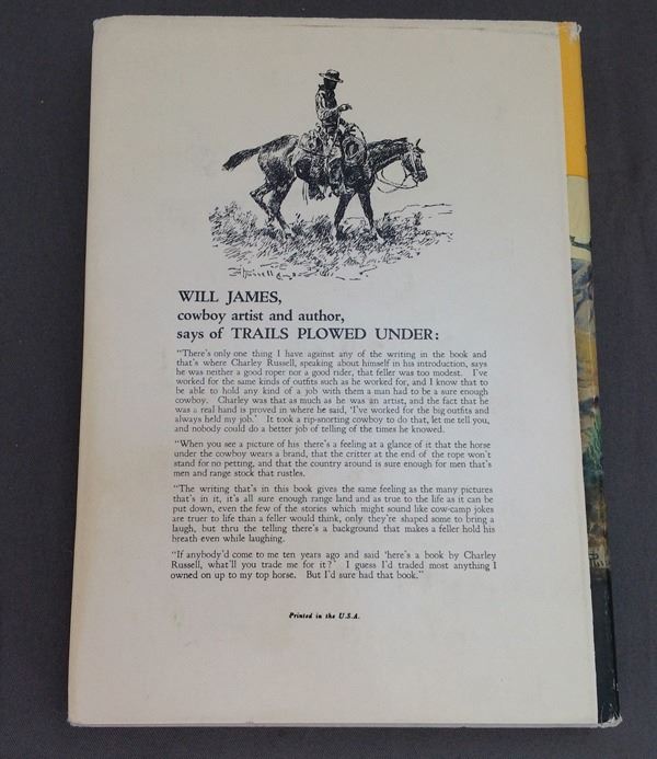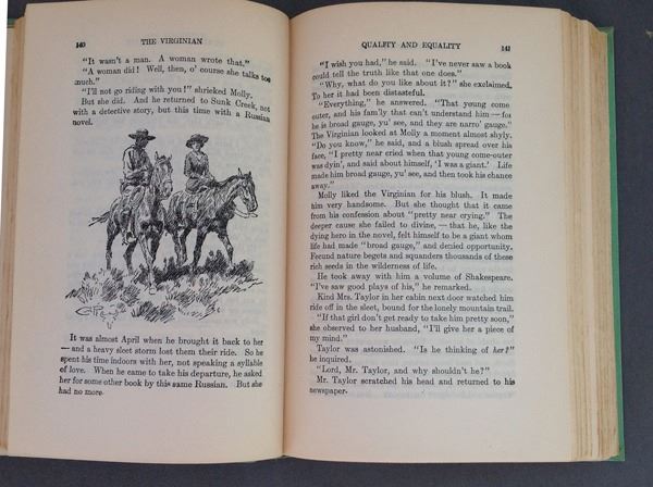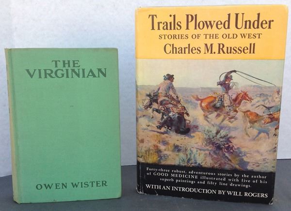 Includes "The Viginian" (by Owen Wister, 506 pages) considered the first true fictional western written, and "Trails Plowed Under" about Charles Russell (210 pages, illustrated.) Good condition.
