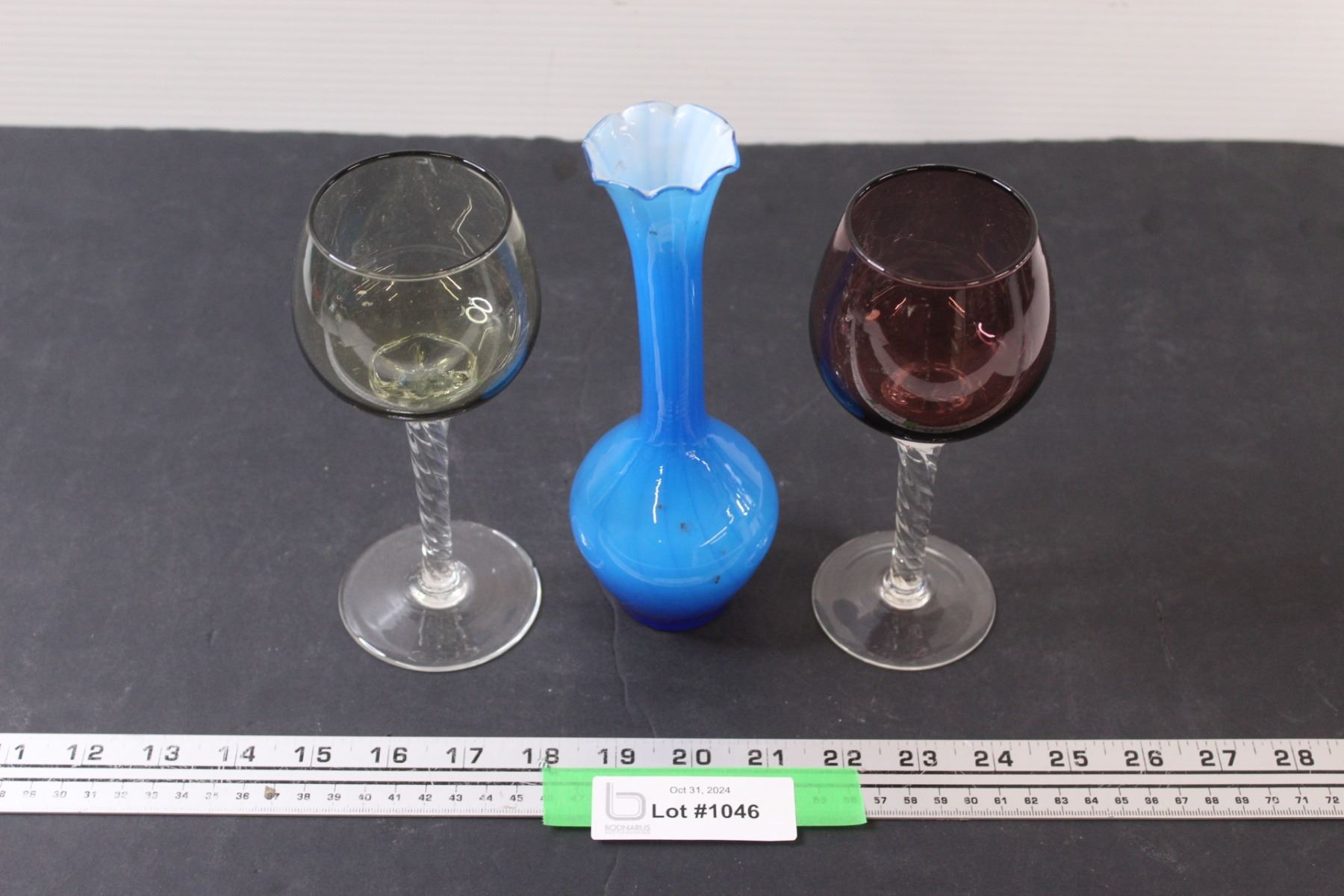 (2) Colored Glass Wine Glasses & Sky Blue Vase