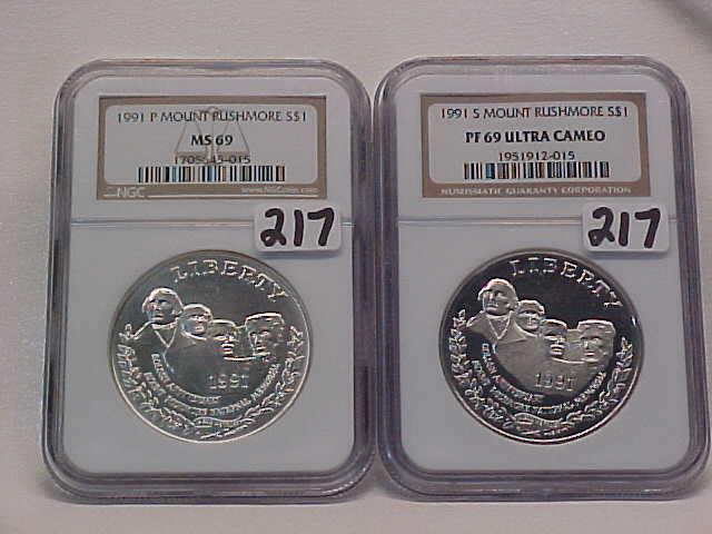 2 Commemorative $, both NGC Mt Rushmore: 1991P MS69, 1991S PF69 Ultra Cam
