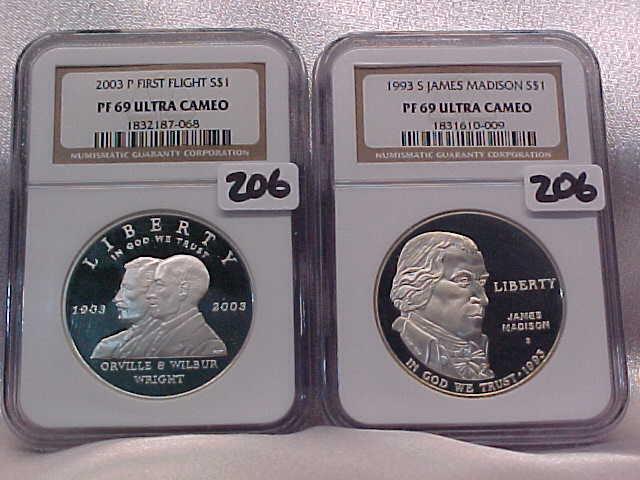 2 Commemorative $ both NGC PF69 Ultra Cameo: 1993S Madison, 2003P 1st Flight