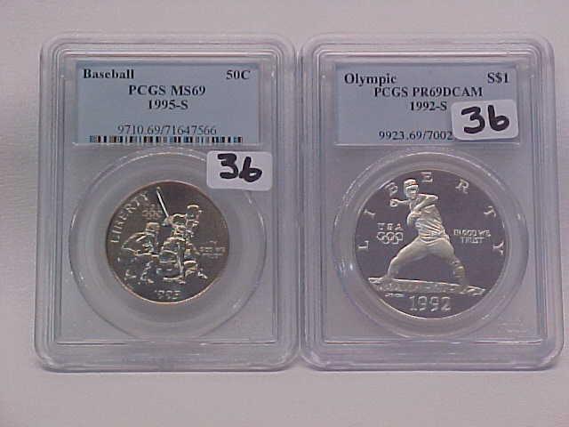 2 Commemoratives: 1992S Olympic Baseball $ PCGS PR69 DCAM, 95S Baseball Half $ PCGS MS69