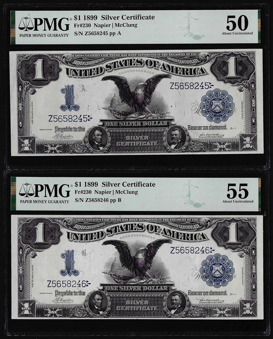 (2) Consec. 1899 $1 Black Eagle Silver Certificate Notes PMG About Uncirculated 50/55