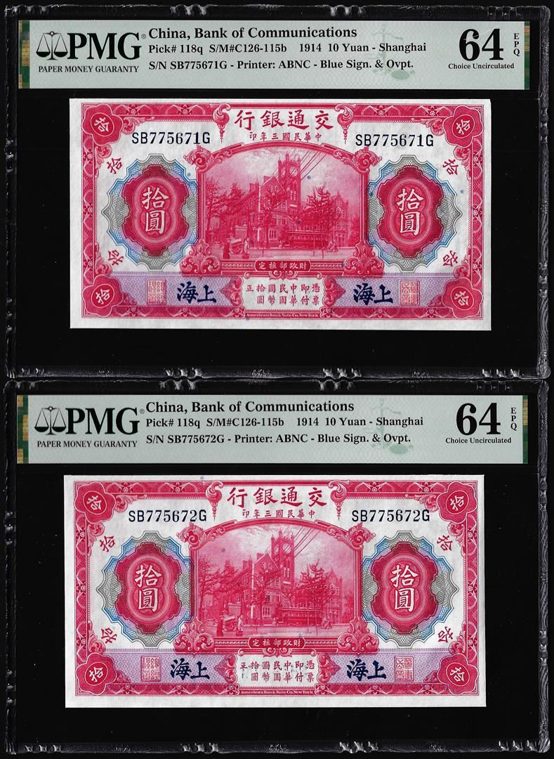 (2) Consec. 1914 China Bank of Communications 10 Yuan Notes PMG Ch. Uncirculated 64EPQ
