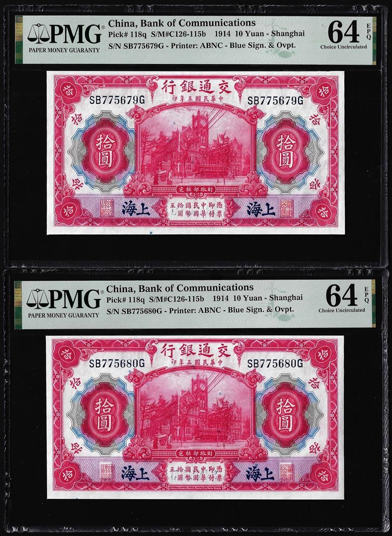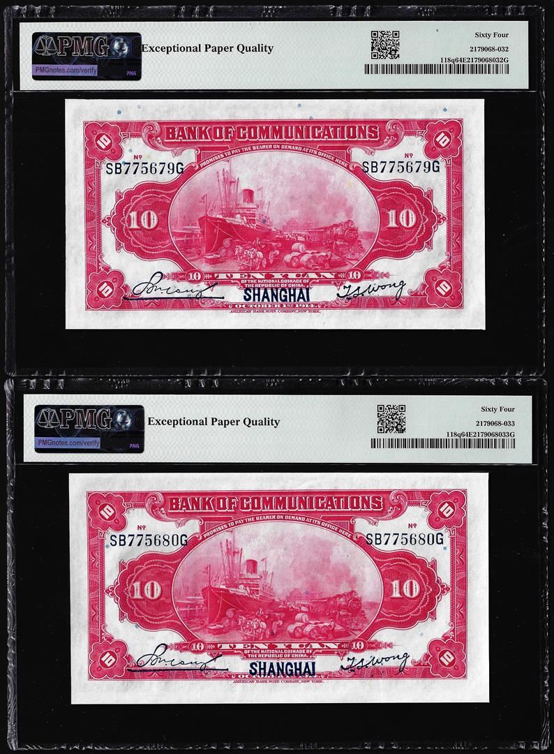 (2) Consec. 1914 China Bank of Communications 10 Yuan Notes PMG Ch. Uncirculated 64EPQ