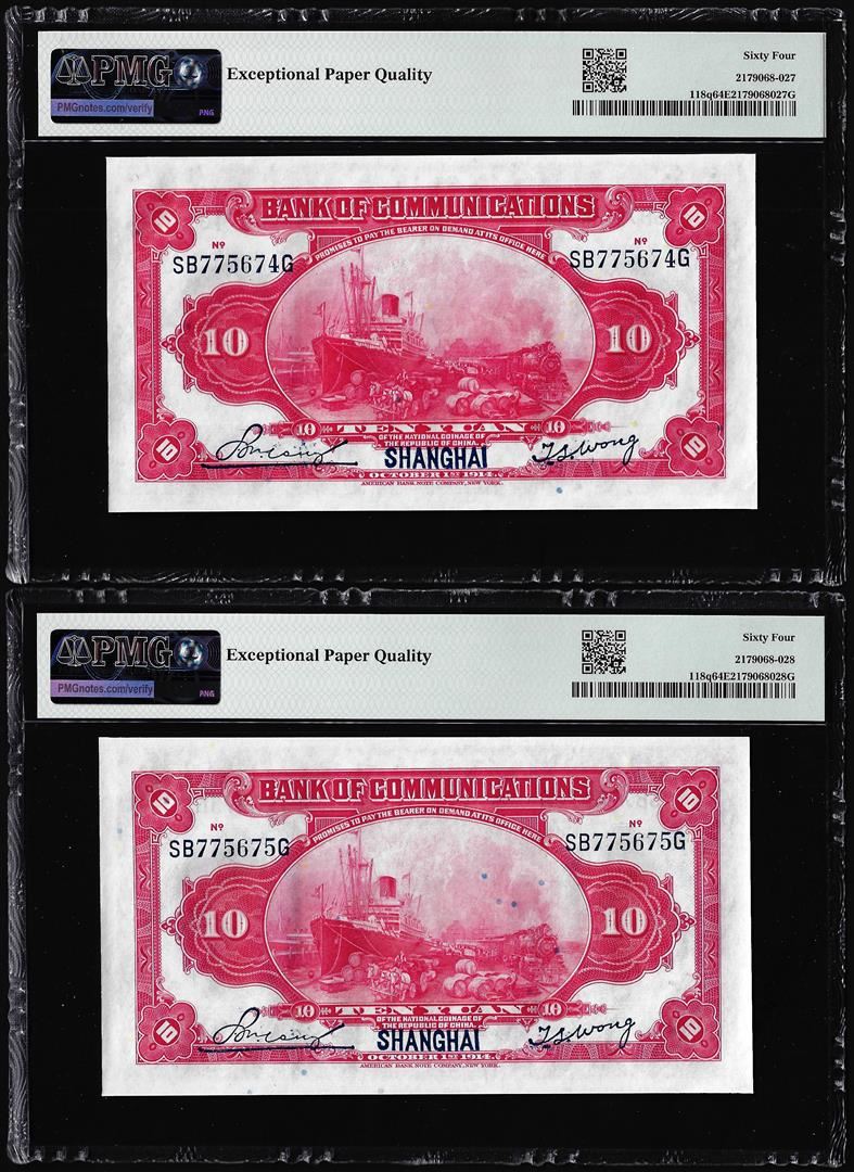 (2) Consec. 1914 China Bank of Communications 10 Yuan Notes PMG Ch. Uncirculated 64EPQ