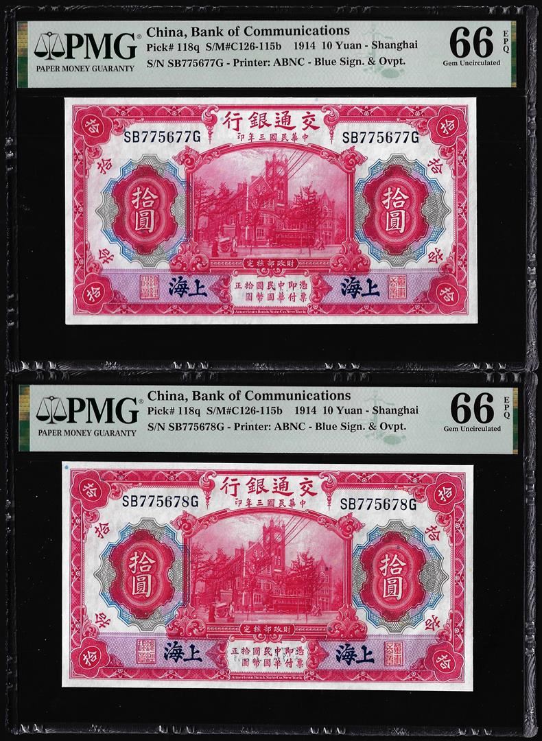 (2) Consec. 1914 China Bank of Communications 10 Yuan Notes PMG Gem Uncirculated 66EPQ