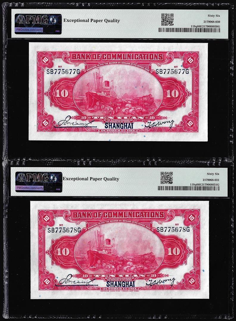One (2) Consec. 1914 China Bank of Communications 10 Yuan Notes PMG Gem Uncirculated 66EPQ. PMG Certified.