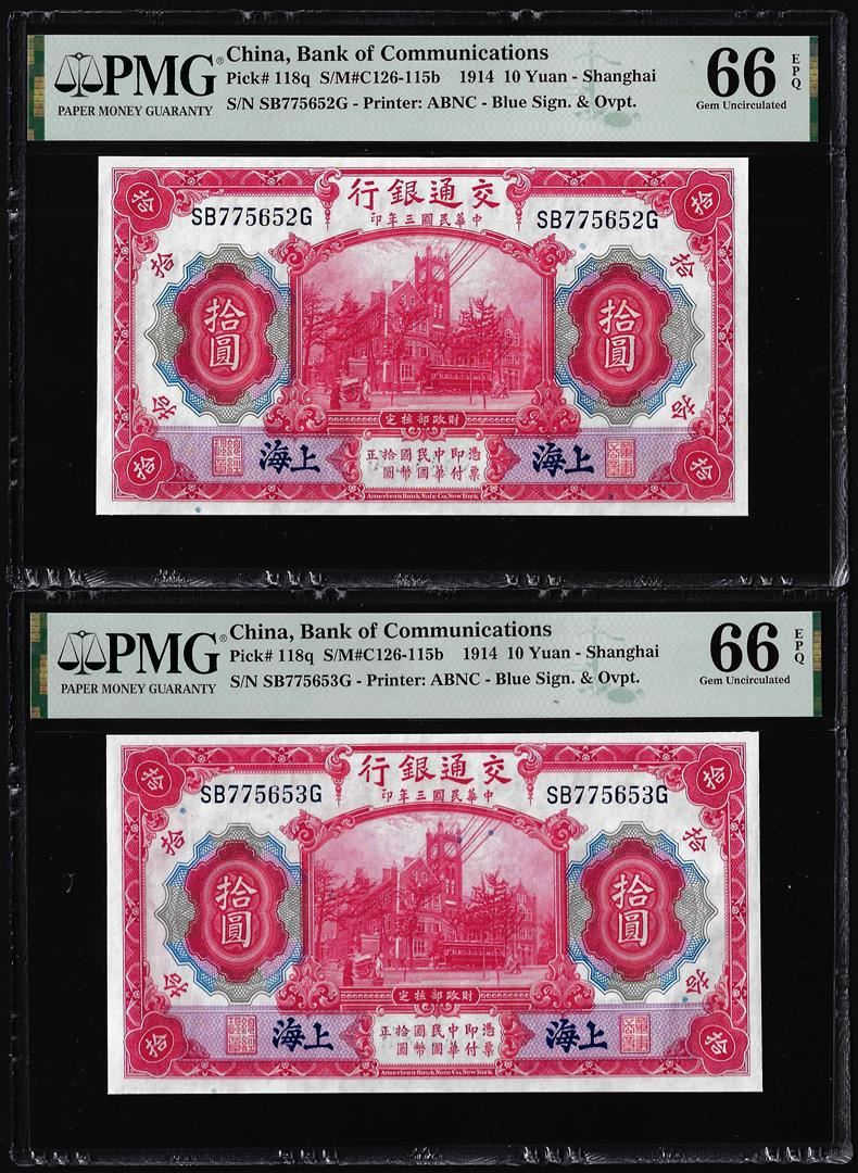 (2) Consec. 1914 China Bank of Communications 10 Yuan Notes PMG Gem Uncirculated 66EPQ