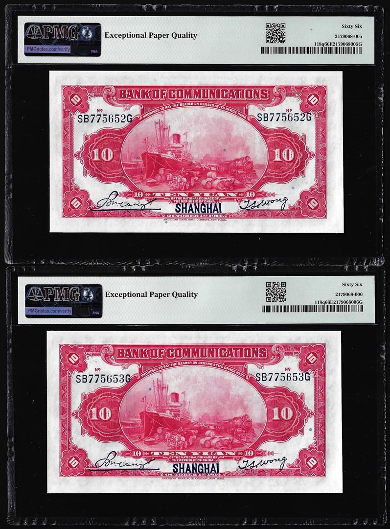 One (2) Consec. 1914 China Bank of Communications 10 Yuan Notes PMG Gem Uncirculated 66EPQ. PMG Certified.