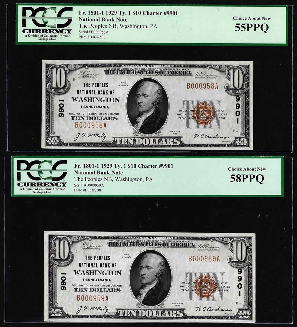 (2) Consec. 1929 $10 Washington, PA CH# 9901 National Notes PCGS Choice AU 55/58PPQ