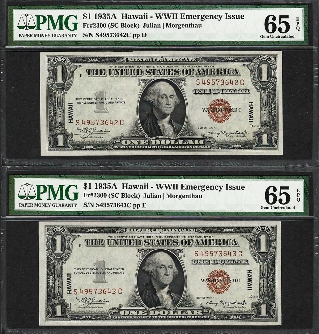 (2) Consec. 1935A $1 Hawaii Silver Certificate WWII Emergency Notes PMG Gem Unc. 65EPQ
