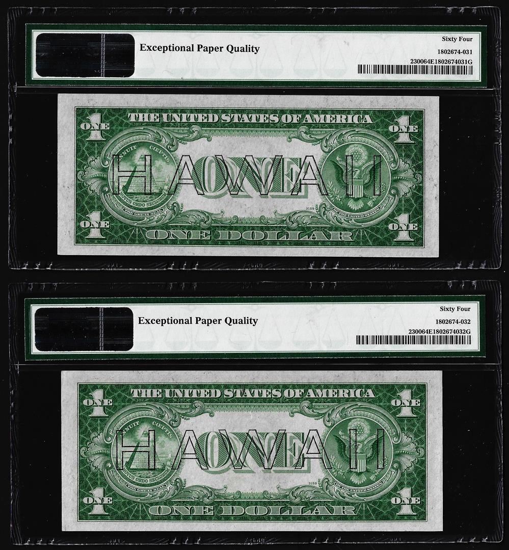 One (2) Consec. 1935A $1 Hawaii WWII Emergency Silver Certificate Notes PMG Ch. Unc. 64EPQ. PMG Certified.
