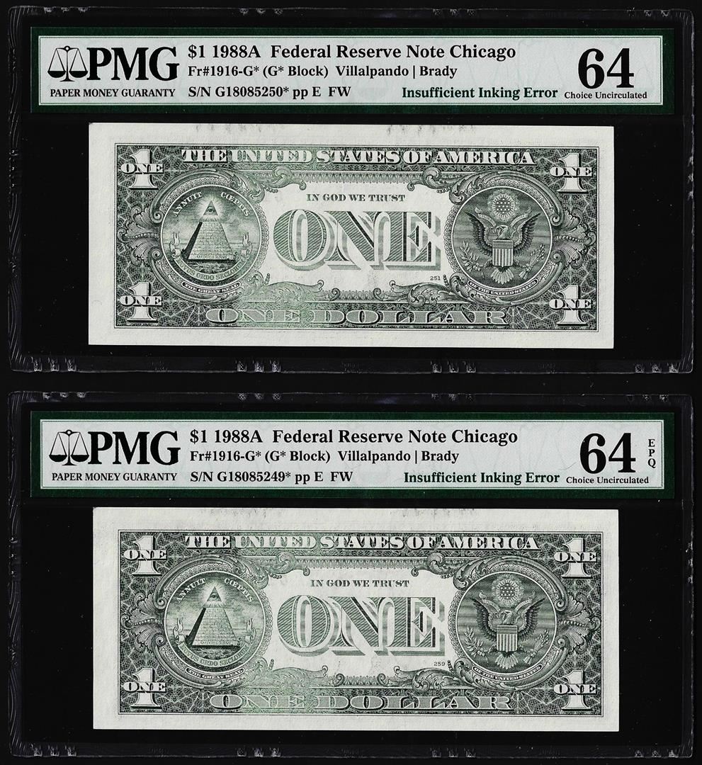 One (2) Consec 1988A $1 Federal Reserve STAR Notes Insufficient Ink ERROR PMG Ch. Unc. 64. PMG Certified.