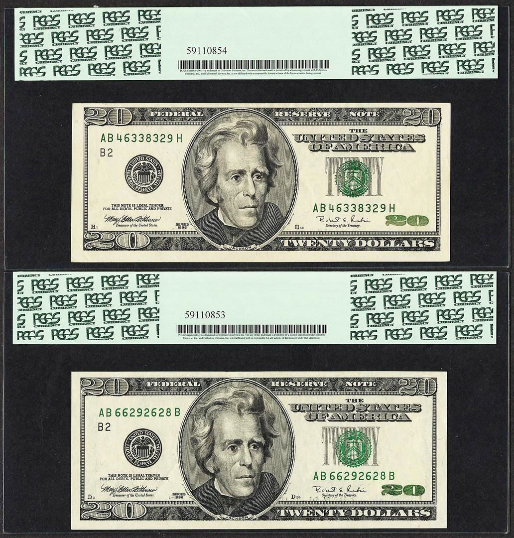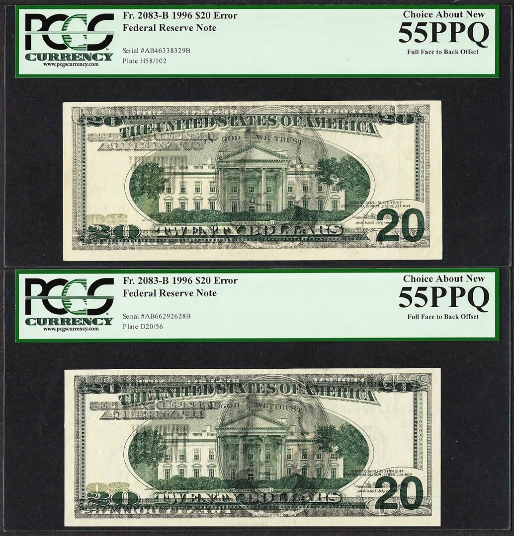 (2) Consec. 1996 $20 Federal Reserve Offset ERROR Notes PCGS Choice About New 55