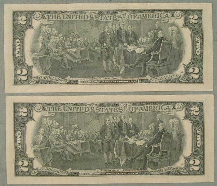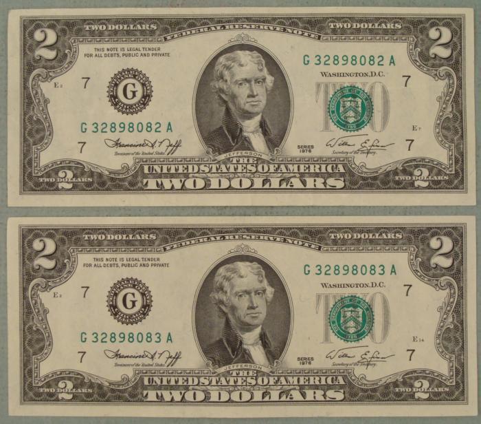 (2) 1976 $2 bills with consecutive serial numbers * Mint marks: G (Chicago) * Bills you receive may be slightly different from the ones shown