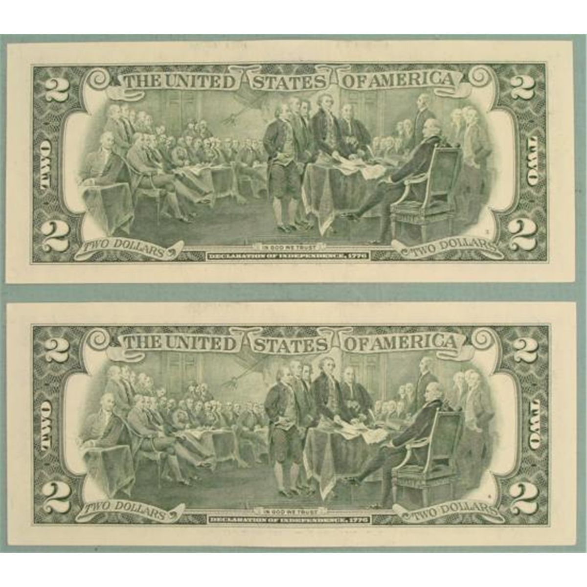 (2) 2003-A $2 bills * * Serial Numbers: Consecutive * Mint mark: F (Atlanta) * Grade: Crisp Uncirculated * *Note: Bills will have different serial numbers than those pictured