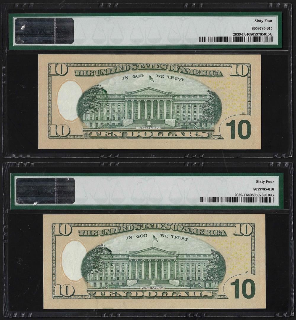 One (2) Consec. 2004A $10 Federal Reserve Over Inking Error Notes PMG Ch. Uncirculated 64. PMG Certified.