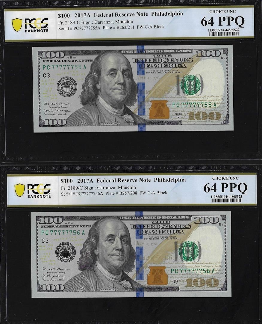 (2) Consec. 2017A $100 Federal Reserve Bank Notes PCGS Choice Unc. 64PPQ Fancy Serial