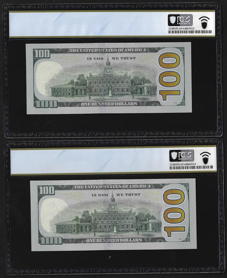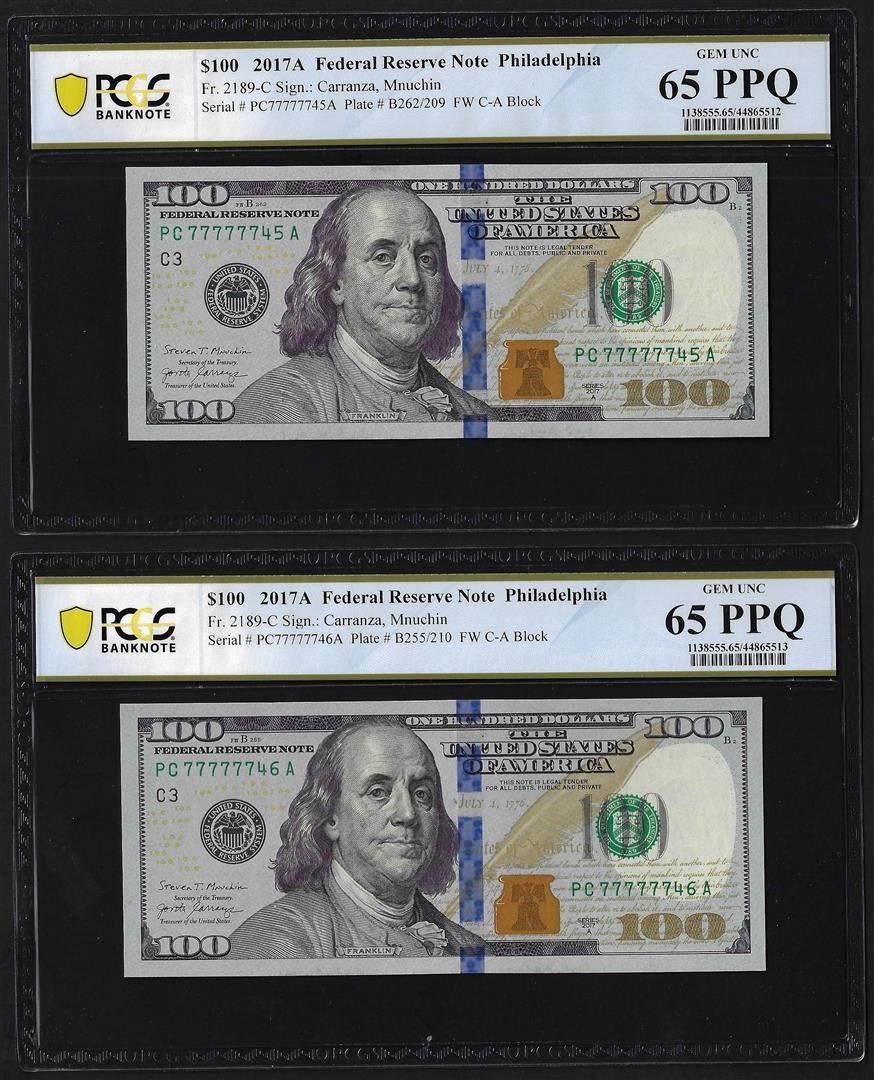 One (2) Consec. 2017A $100 Federal Reserve Bank Notes PCGS Gem Unc. 65PPQ Fancy Serial. PCGS Graded.