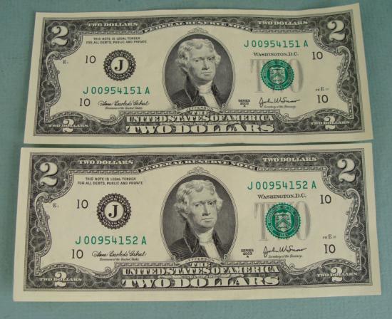 (2) 2003-A $2 bills * * Serial numbers: Consecutive * Mint mark: J (Kansas City) * Grade: Crisp Uncirculated * *Note: Bills will have different serial numbers than those pictured