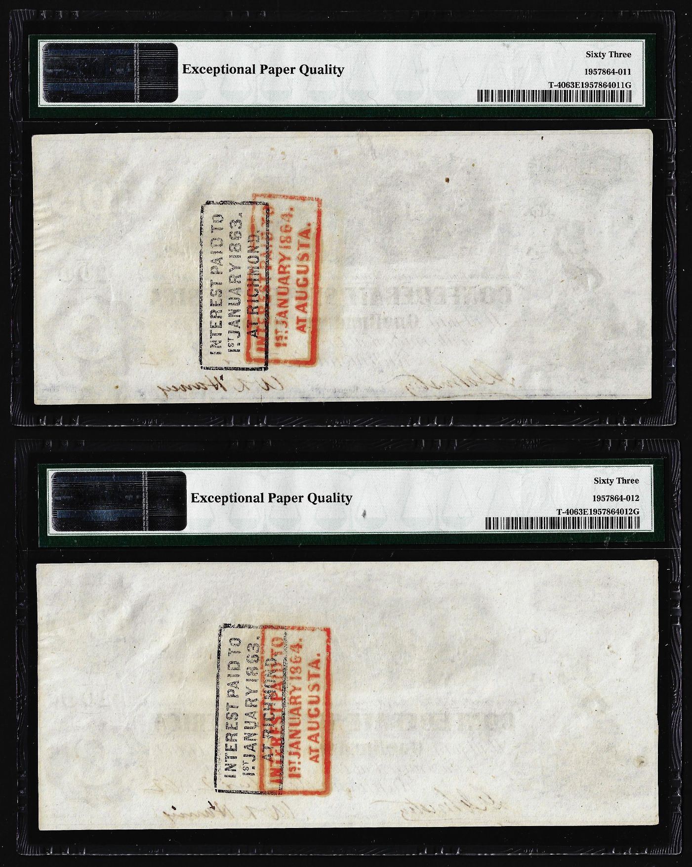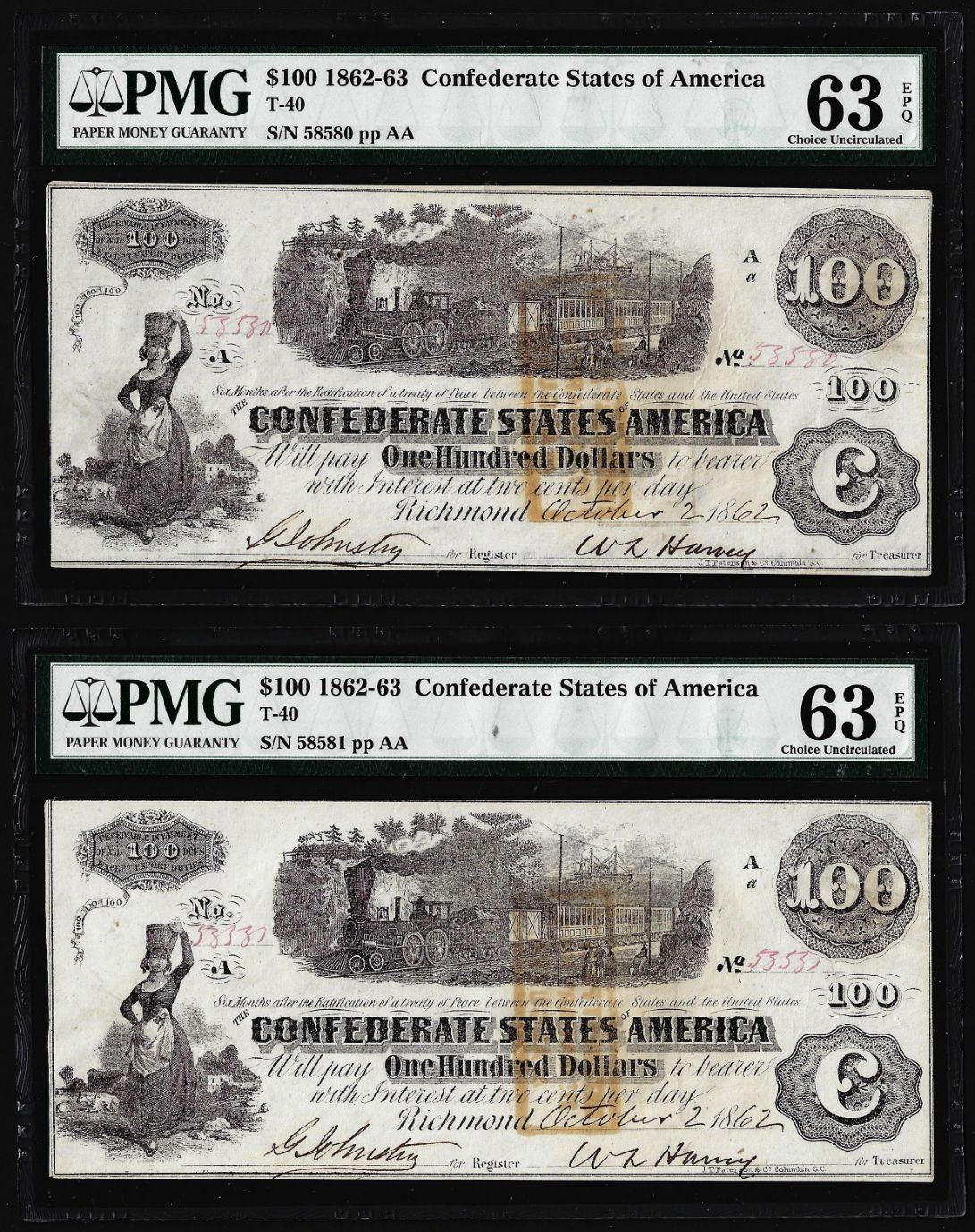 One (2) Consecutive 1862 $100 Confederate States of America Notes PMG Ch. Uncirculated 63EPQ.