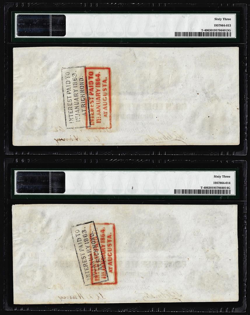One (2) Consecutive 1862 $100 Confederate States of America Notes PMG Choice Uncirculated 63. PMG Certified.