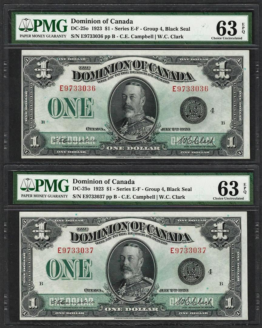 One (2) Consecutive 1923 $1 Dominion of Canada Notes DC-25o PMG Choice Uncirculated 63EPQ. PMG Certified.