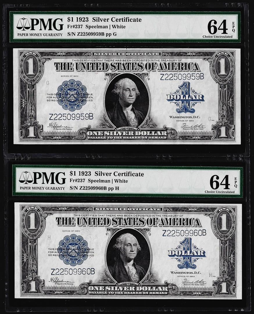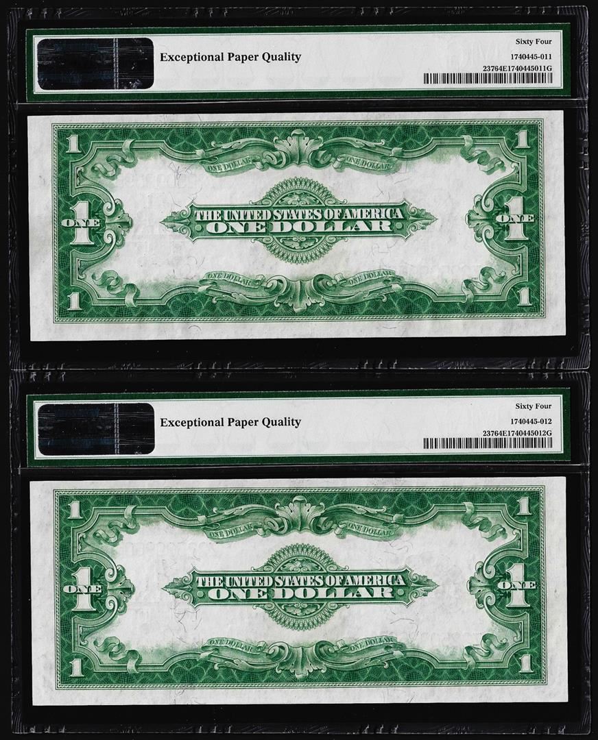 One (2) Consecutive 1923 $1 Silver Certificate Note Fr.238 PMG Choice Uncirculated 64EPQ. PMG Certified.
